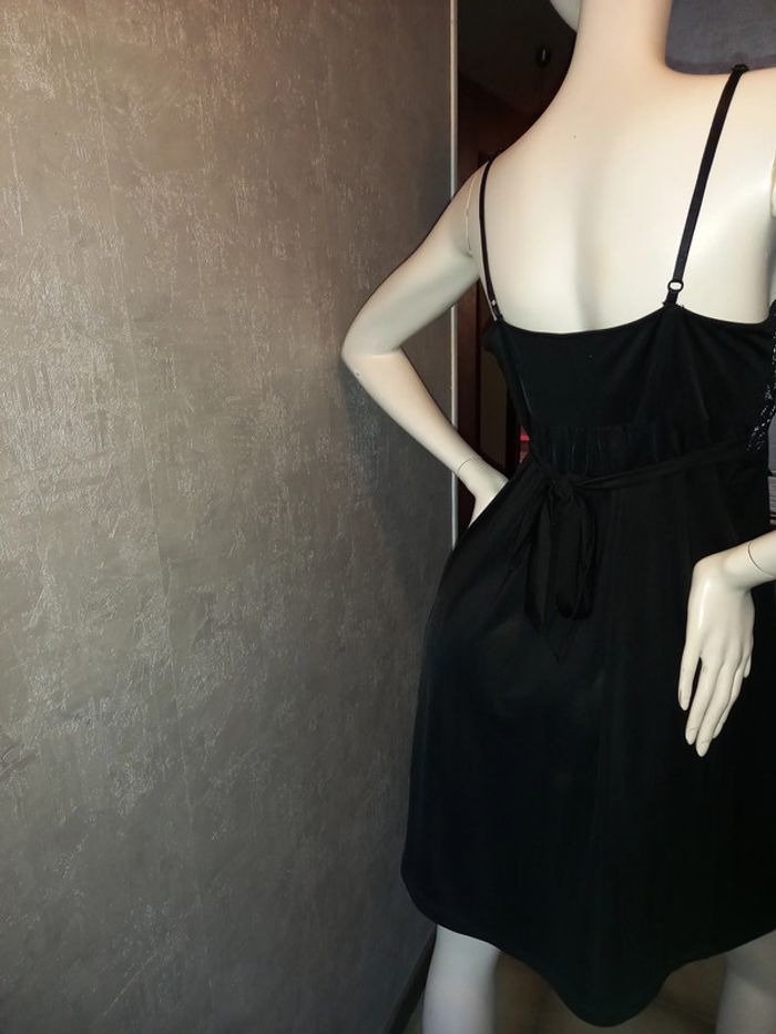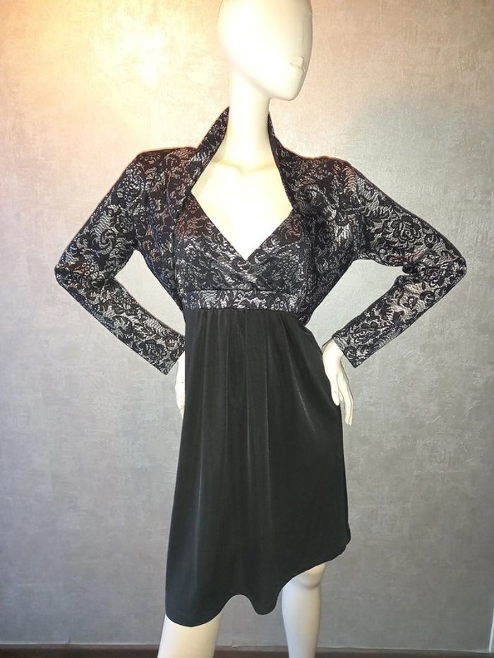 robe argenté et noire dentelle avec boléro assorti taille 42, étiquette composition coupée mais matière élasthane, robe : largeur aisselle à aisselle 45 cm, longueur du dessous de bras à en bas 73 cm, bretelle réglable en longueur ; boléro : largeur aisselle à aisselle 48 cm #42petitefee3
