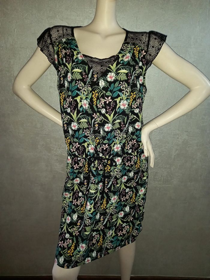 robe noire fleurie et dentelle lady blush taille 42, se resserre avec un lien à la taille, largeur aisselle à aisselle 52 cm, longueur du dessous de bras à en bas 71 cm, matière 100 % polyester, matière non élasthane #42petitefee3