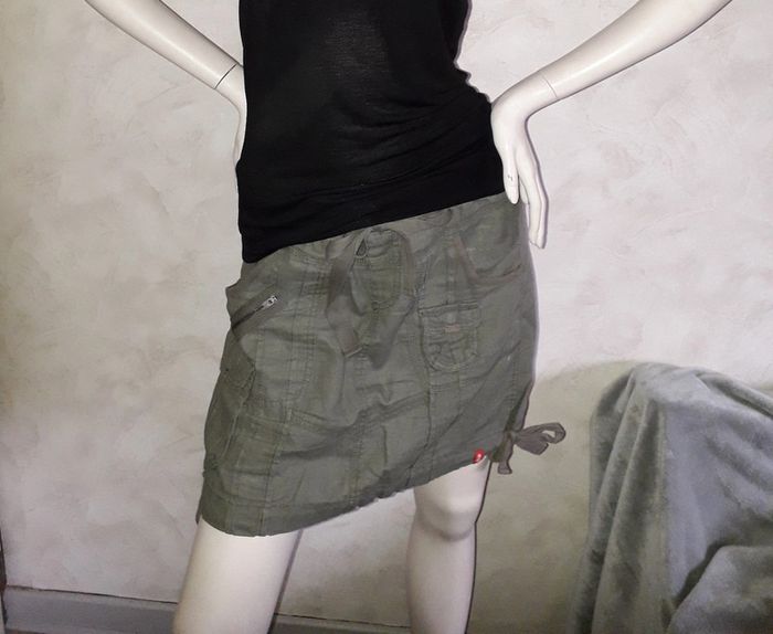 jupe en lin kaki esprit, marqué taille 38 mais taille 40, taille élastique, longueur totale 40 cm, peut se resserrer en bas avec les liens sur les cotés #40petitefee3