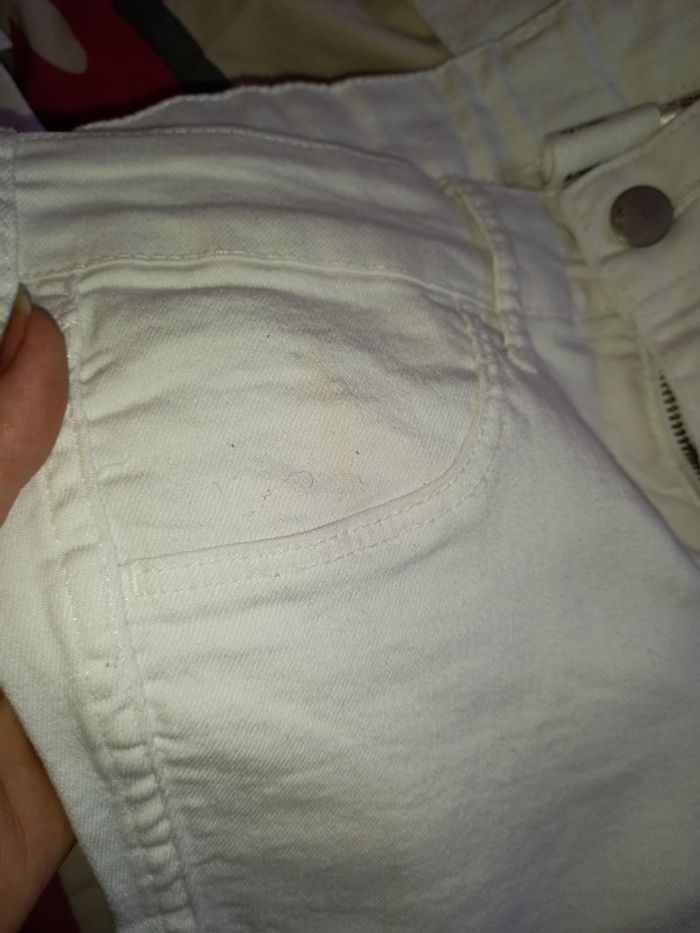 jeans skinny blanc élasthane H&M taille 36 française ( largeur à la taille 36 cm), taille 27 américaine, longueur de l'entre jambe à en bas 76 cm, hauteur de l'entre jambe à la taille 19 cm, matière 79 % coton, 19 % polyester et 2 % élasthane, léger trait jaune en haut de la poche droite qui ne se voit quasi pas ( photo sur l'annonce) #36petitefee3