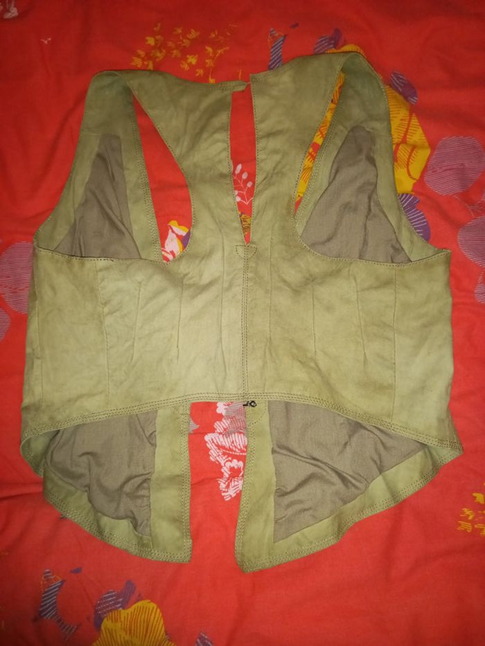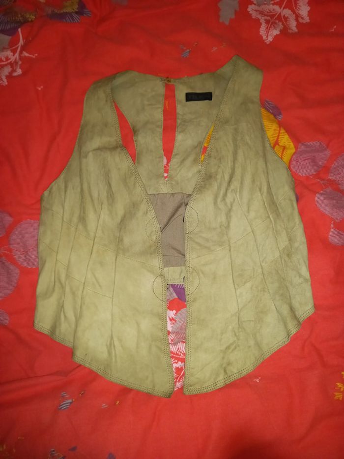 gilet en cuir de chèvre beige IKKS taille 40, largeur aisselle à aisselle 45 cm, longueur du dessous de bras à en bas au plus court 23 cm, longueur de l'épaule au plus bas 59 cm #40petitefee3