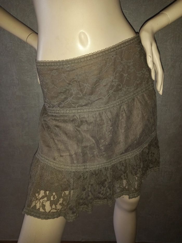 jupe dentelle couleur taupe camaïeu taille 40, matière 100 % polyester et doublure 100 % coton, largeur taille 41,5cm, longueur 42,5 cm #40petitefee3