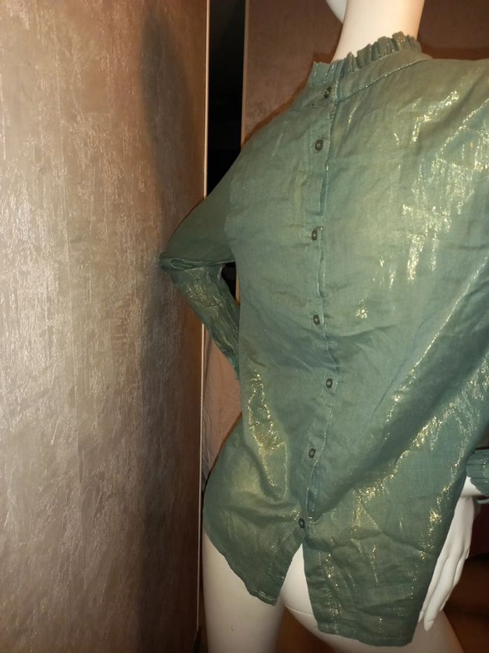blouse verte et doré brillante monoprix taille 40, bouton dans le dos, largeur aisselle à aisselle 50 cm, matière non élasthane #40petitefee3