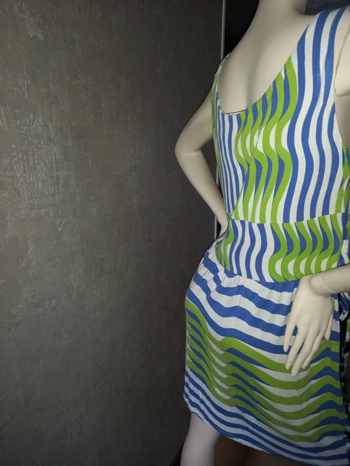 robe desigual coloré, marqué taille L mais taille 42, matière 100 % viscose ( élasthane), largeur aisselle à aisselle 49 cm, longueur du dessous de bras à en bas 73 cm, mégèrement fluché à l'intérieur mais ça ne se voit pas quand elle est porté #42petitefee3