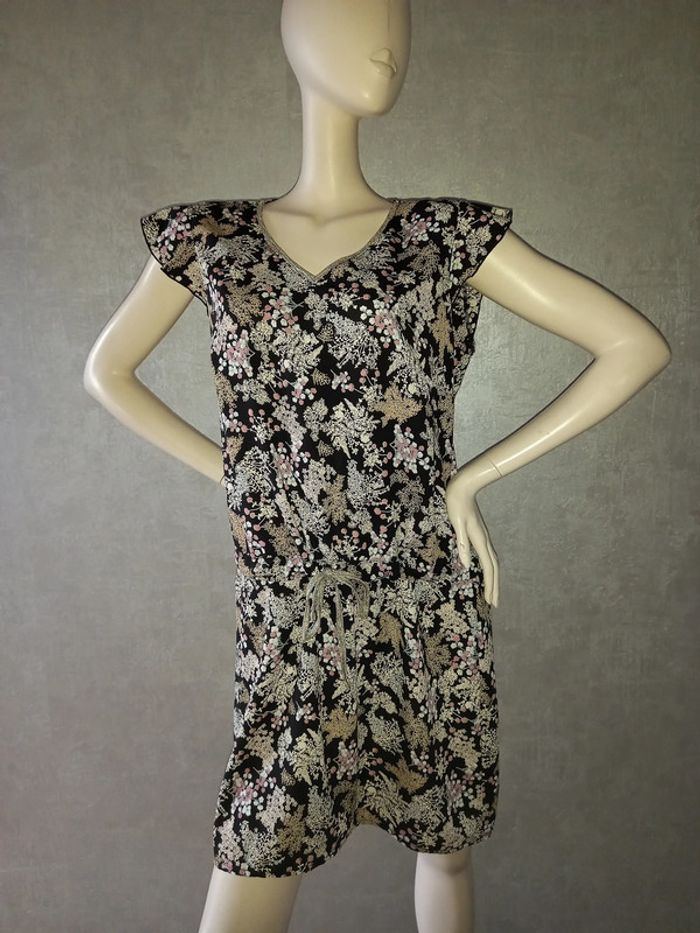 robe noire et fleurie promod taille 42, étiquette de la marque et de la taille coupée, largeur aisselle à aisselle 51 cm,matière non élasthane,élastique à la taille qui se resserre avec un lien, longueur du dessous de bras à en bas 69 cm #42petitefee3