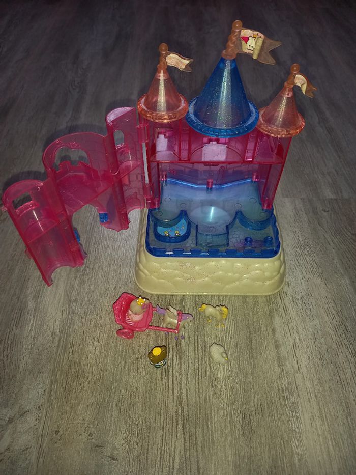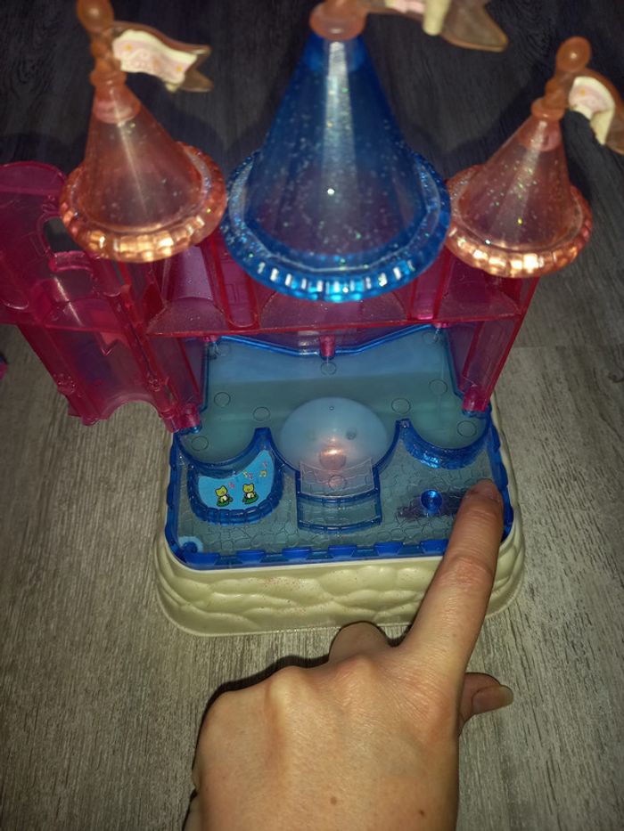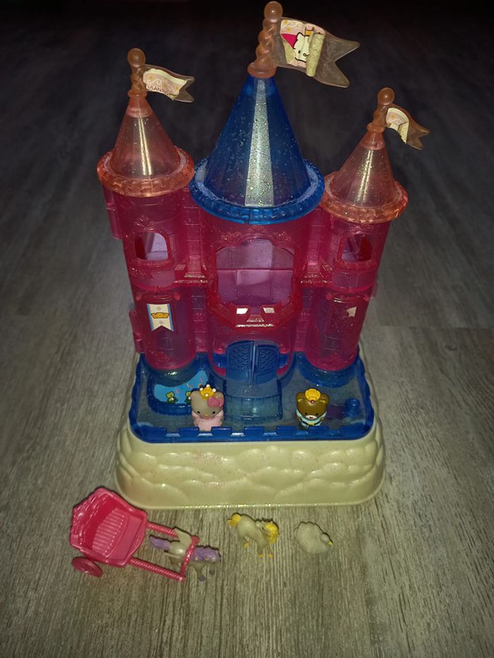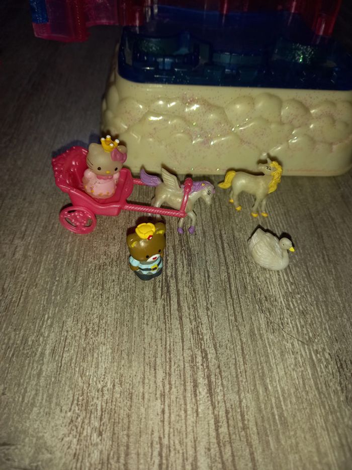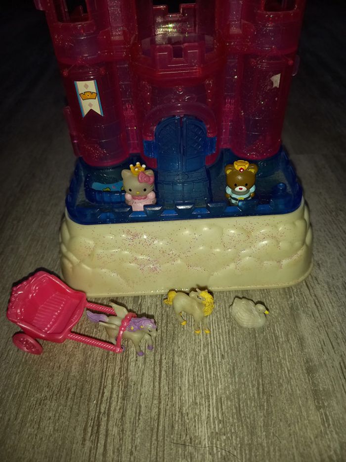 château lumineux hello kitty avec personnages : le roi et la reine hello kitty, carosse et cheval ailé, cygne ; le chateau s'illumine quand on appuie sur le bouton devant ( les piles seront à changer), hauteur total du chateau 23 cm, largeur 15 cm, les autocollants des drapeaux sont décollés par endroit, les portes du chateau s'ouvrent et se ferment, le chateau s'ouvre et se ferme aussi #jouetpetitefee3