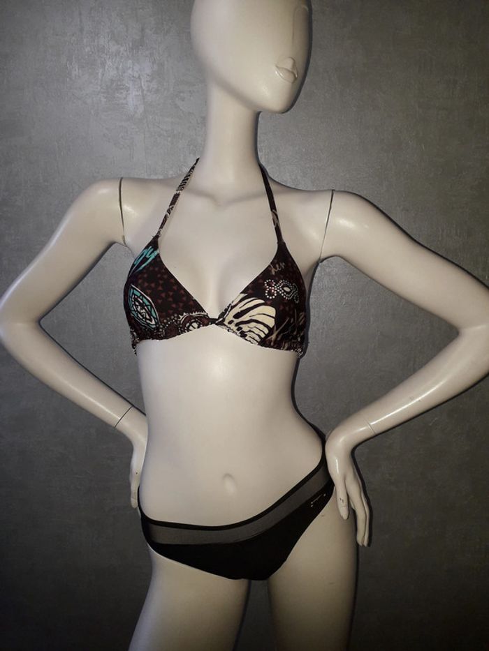 maillot de bain 2 pièces noir et coloré taille 38/40, dépareillé : le bas marqué valclub taille 38/40 ( marqué taille 40 mais taille petit) et le haut triangle marque tex taille 38/40 #38petitefee3