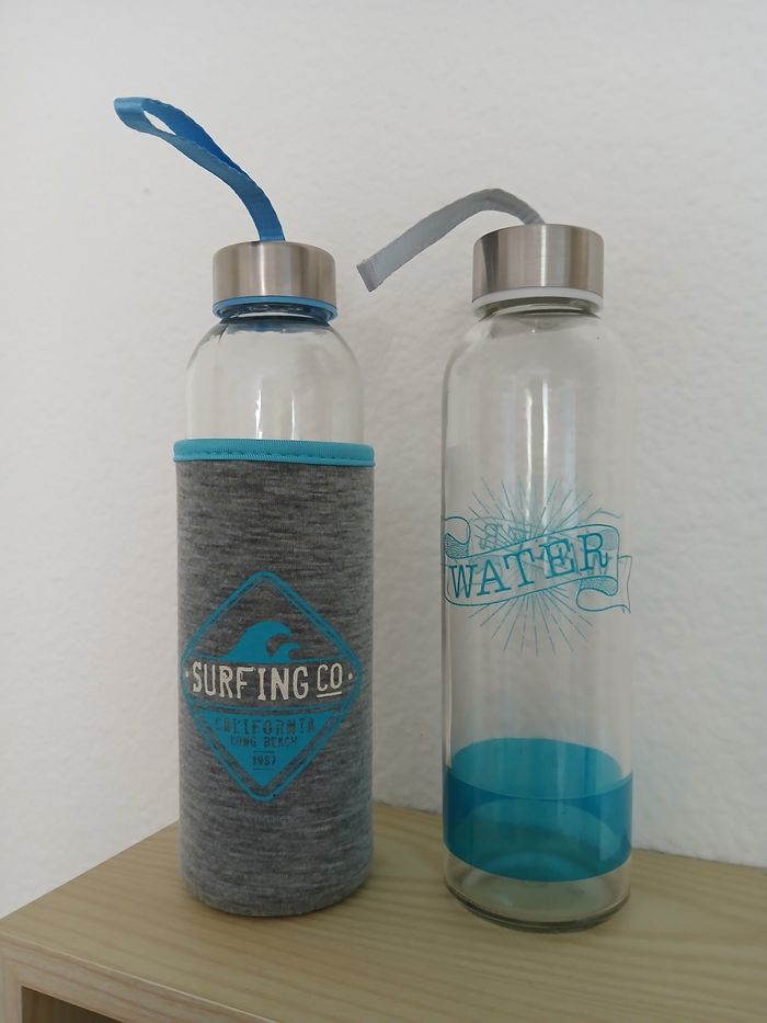 Belles bouteilles pratique pour transporter vos boissons. En plus de la bouteille en verre, la bouteille est livrée avec une pochette en néoprène pour conserver la boisson dans les meilleures conditions. Le couvercle est muni d'une poignée confortable pour faciliter le transport. Mesure environ 12 cm de haut et 6 cm de diamètre. Capacité de 50cl. Même litrage pour la seconde.