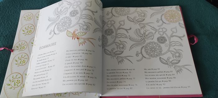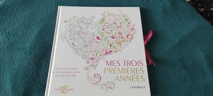 Album Mes trois premières années pour fille, avec coloriage. Se ferme avec un ruban rose sur le côté. Editions white star, 27 cm x 29 cm, 95 pages. Acheté à 12,90 euros. Envoi rapide, prix négociable.