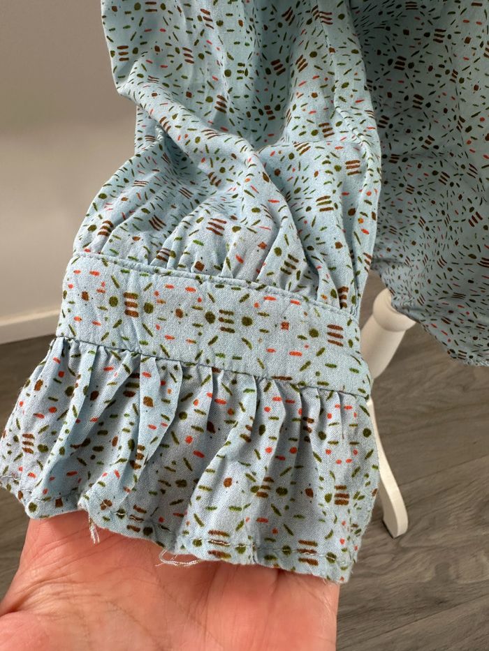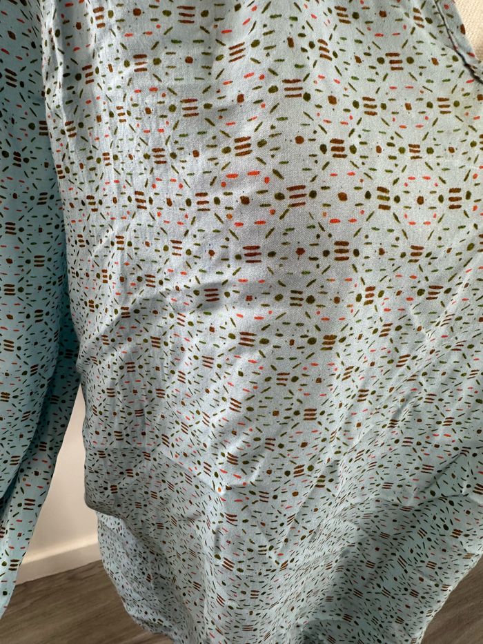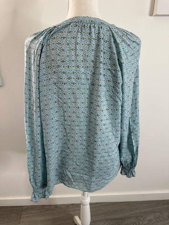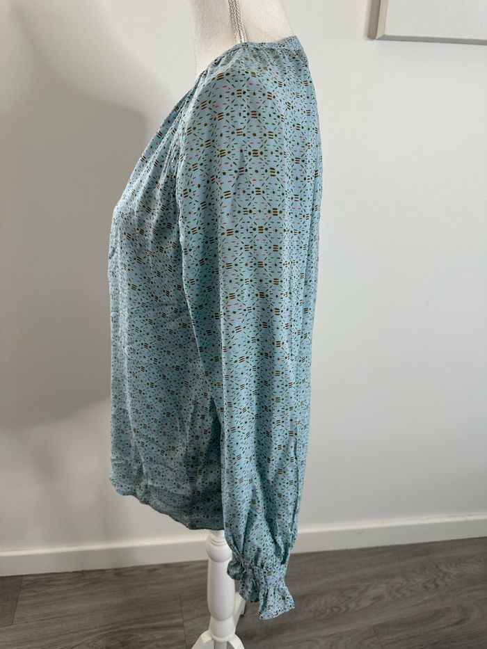 Blouse - Excellent état - Taille 38 équivalent M - Bleu ciel bleu clair - Manches longues - Col en V - Imprimés bariolés - Pas d’étiquette de matière Dimensions: - 54cm niveau aisselles - 60cm de long