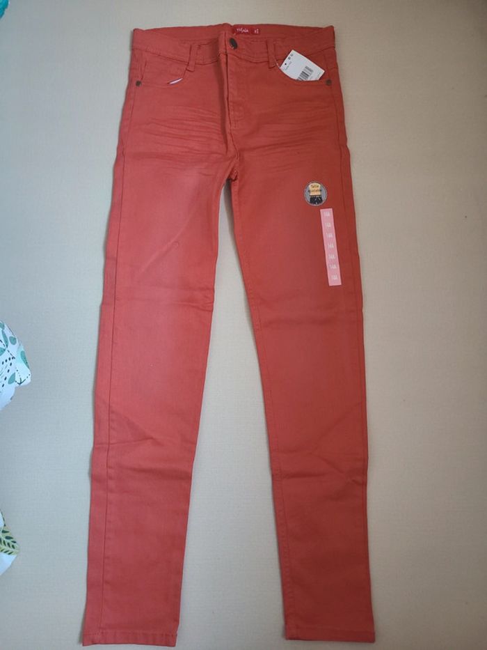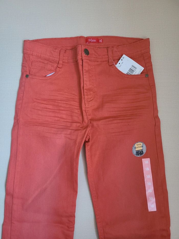 Pantalon neuf avec étiquette. Taille 14 ans. Taille ajustable. Couleur: corail 98% coton et 2% elasthane