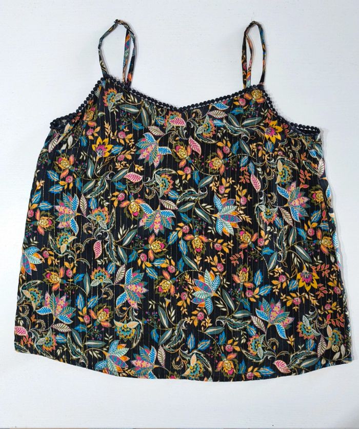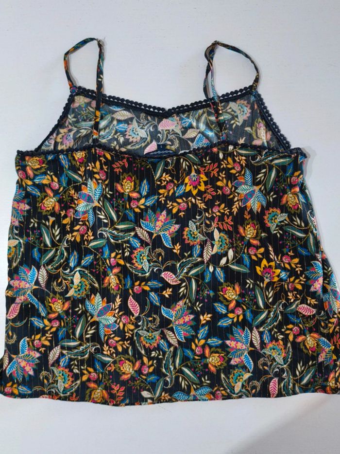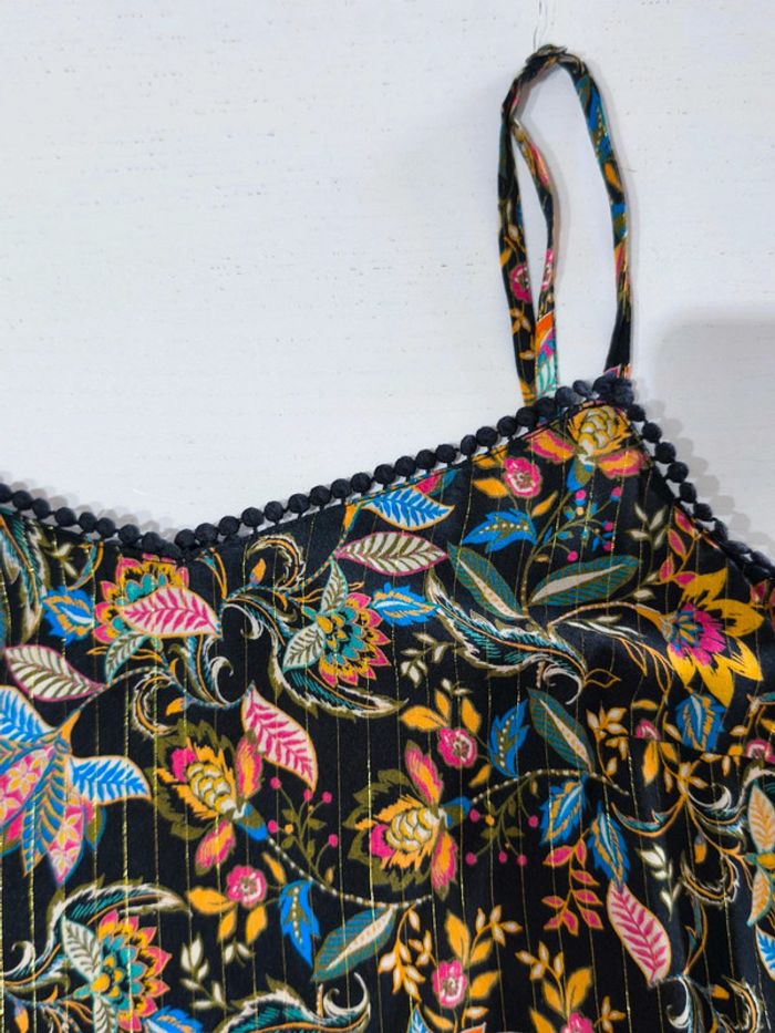 Top à bretelles réglables coloris noir avec lignes dorées motif floral. Marque Bonobo taille S. Blouse noir avec motif et lignes dorées marque Bonobo taille XS. Bas des manches smocké. #ledressdejena_tailleS #ledressdejena_taille36