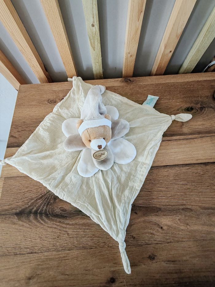 Doudou plat Ours lange de coton beige et blanc BABY NAT Tbe 20 euros Étiquette marque présente