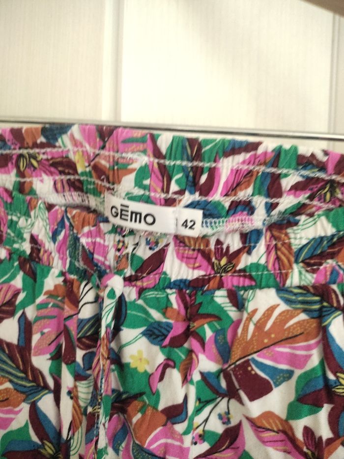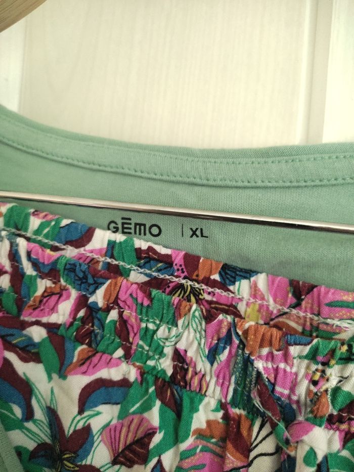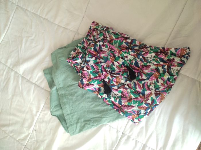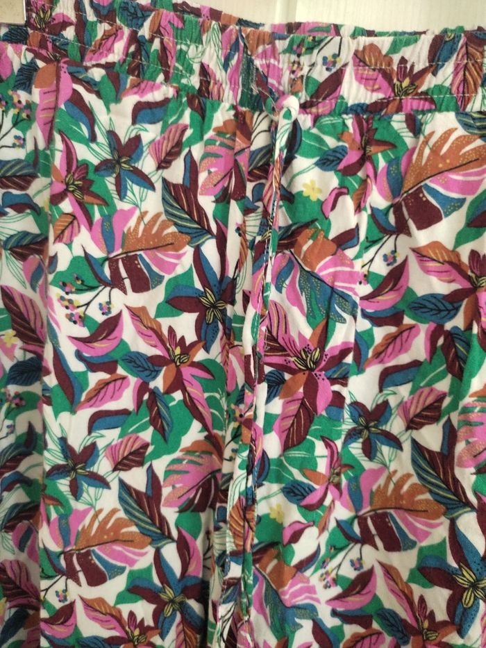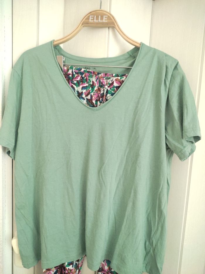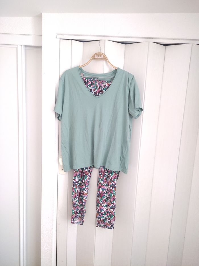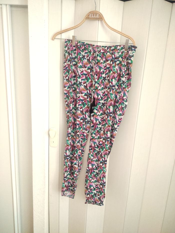 Joli look femme été composé d'un pantalon coton majoritaire vert , rose ....avec poches latérales, taille élastique et tee shirt vert amande en coton , le tout taille xl 42 en très bon état général et propre. N hésitez pas à revenir vers moi si besoin. Merci