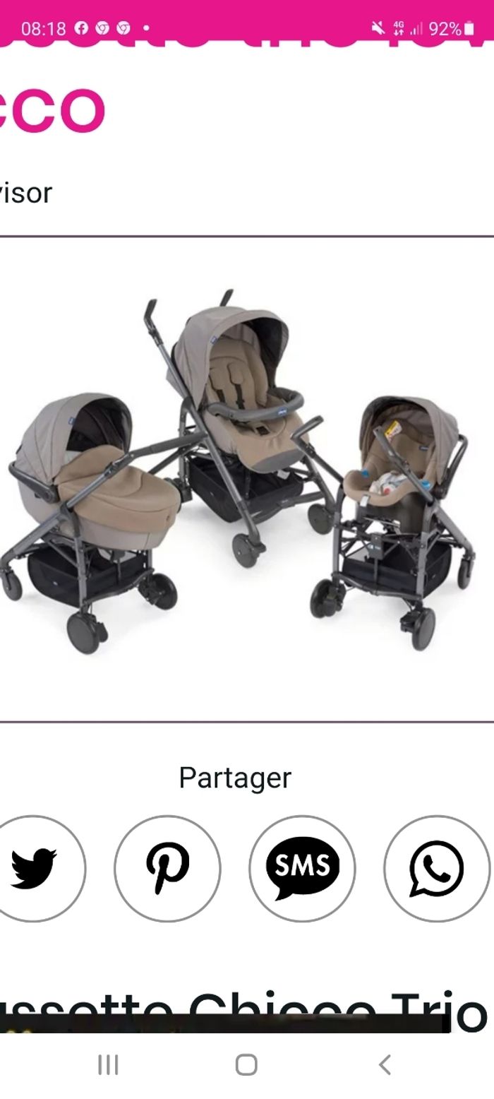 Bonjour je vend poussette trio De la marque chicco trio love . La poussette et en bon état roule très bien très maniable pliage facile prend pas beaucoup de place plier très confor pour bébé.... si intéresser contacter moi