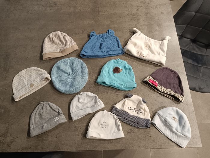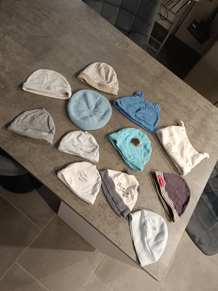 Lots bonnet de naissance porté une fois voir pas du tout. Lavé.