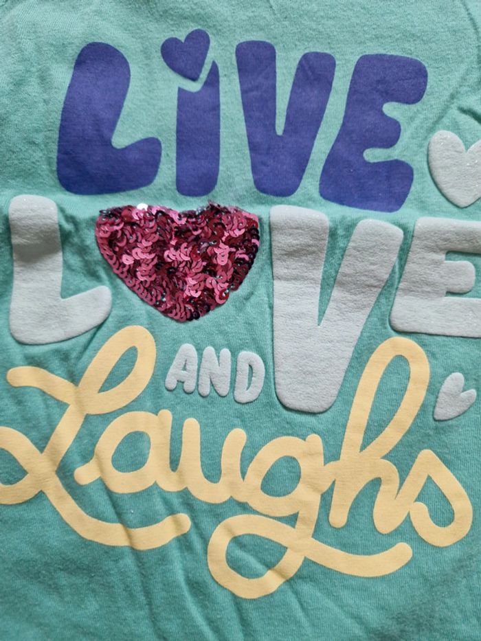 Débardeur été fille avec inscriptions live love and laught en plusieurs couleurs et textures. petit cœur rose en sequins #sarahzajacfille6a