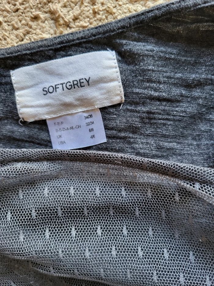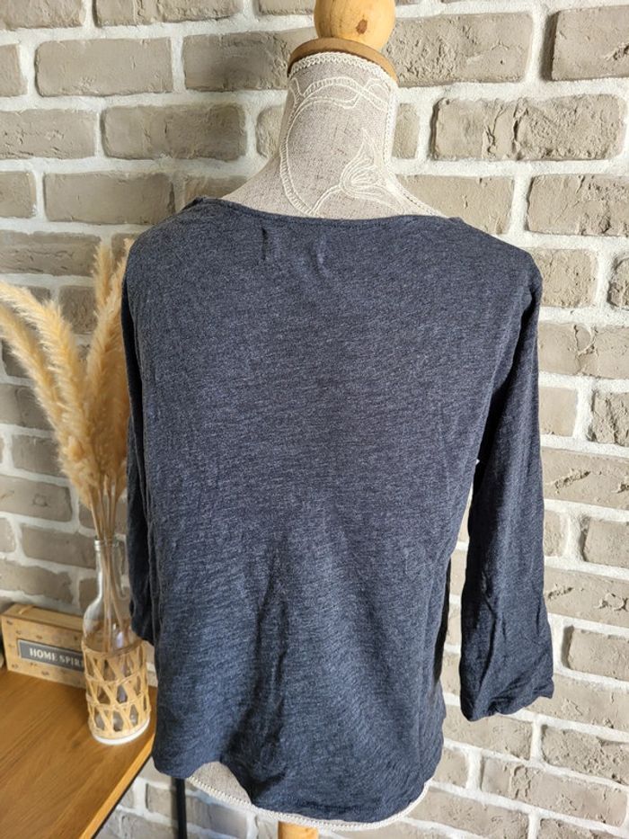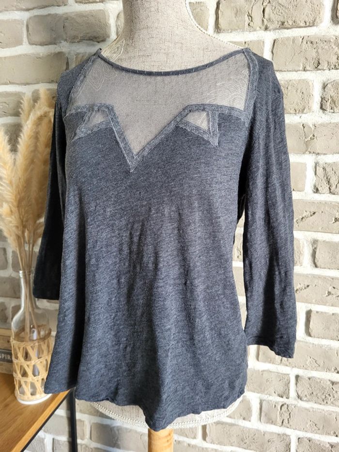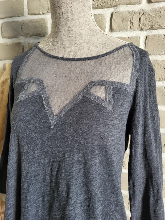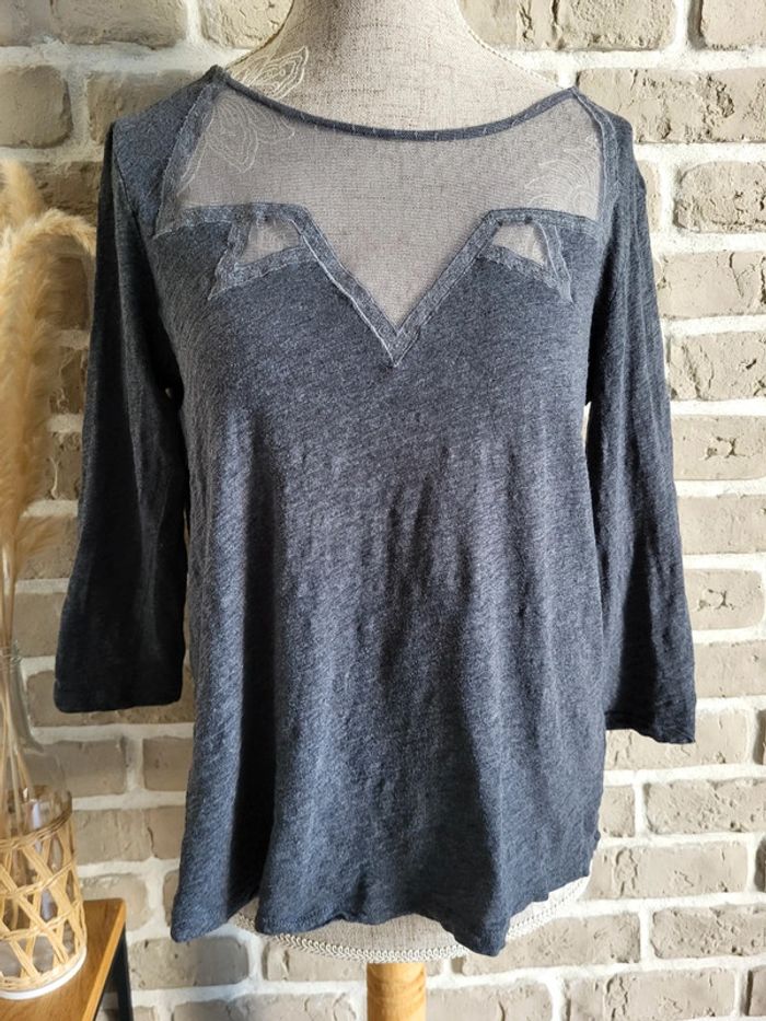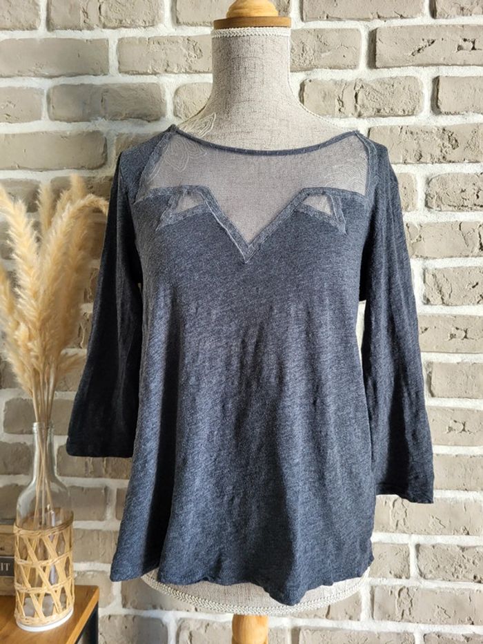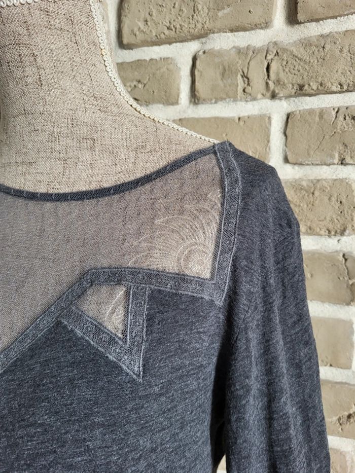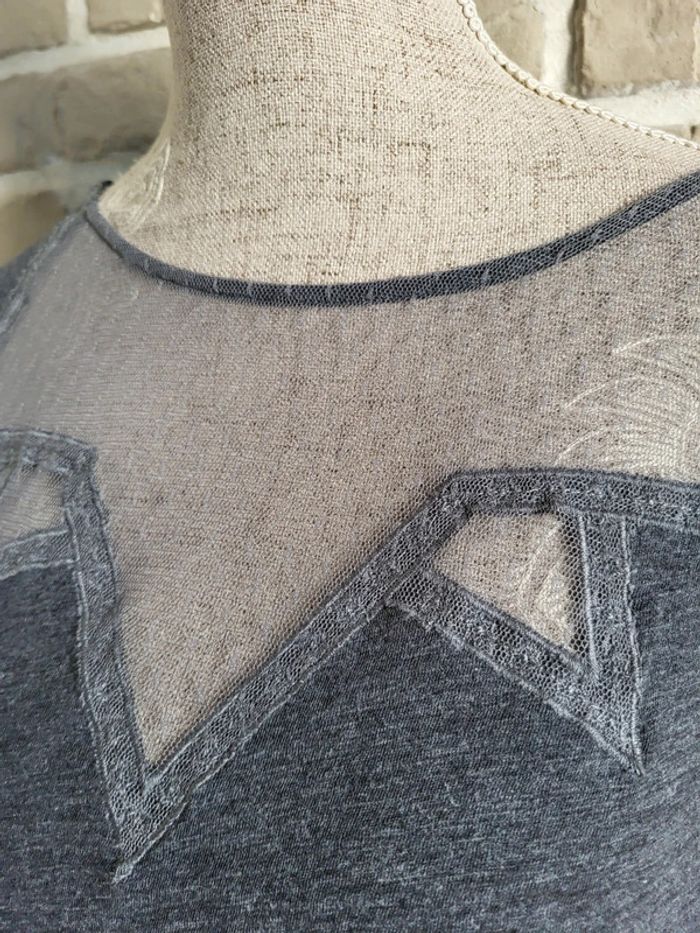 💝 Bénéficiez d'une réduction en créant lot dans mon dressing 🛍️ 🌸 Joli haut à manches 3/4, collection Soft Grey de La Redoute en très bon état, sans défaut 🎀 Matière légère 100% coton de couleur gris anthracite 🪷 Empiècement en dentelle, style fine résille, sur le haut du buste Coupe près du corps, légèrement évasée pour ne pas être moulante 🍥 Taille S 36 🩷 Ce haut allie élégance et confort et permet différents looks : casual avec un jean brut ou noir, très féminin avec une jupe, rock avec un pantalon en simili...