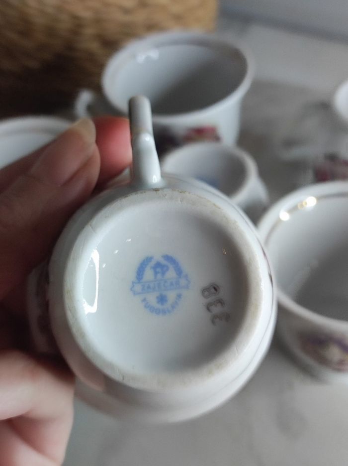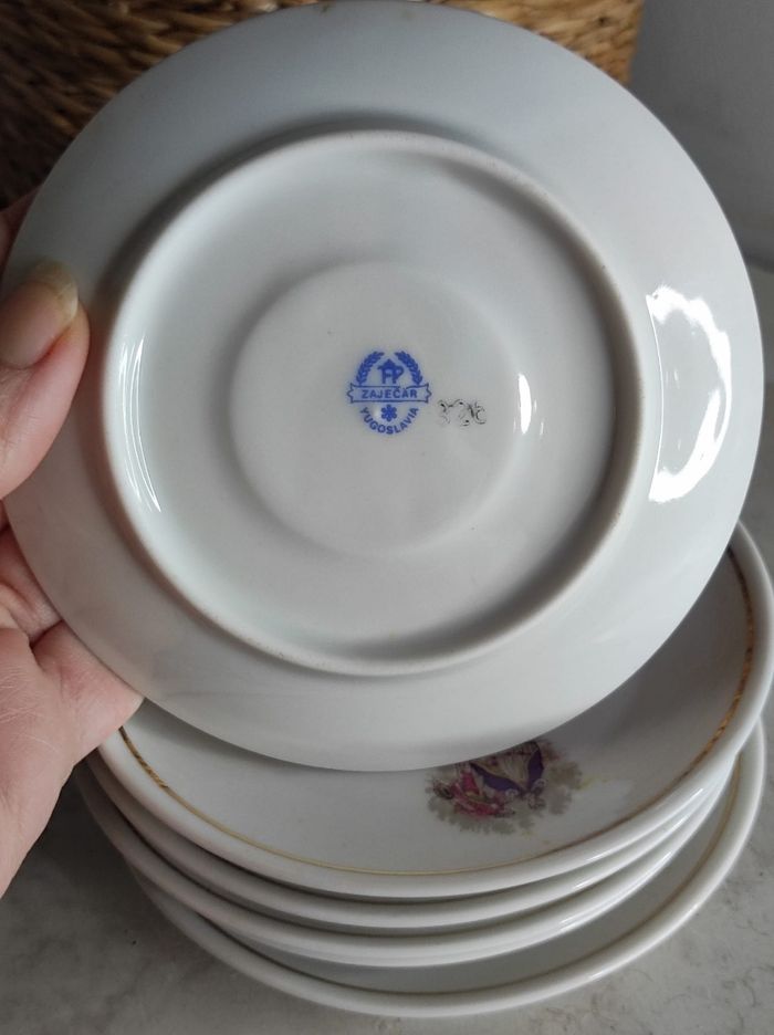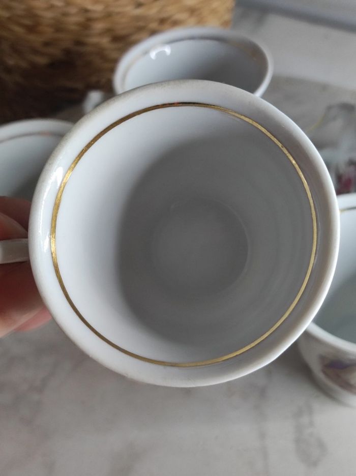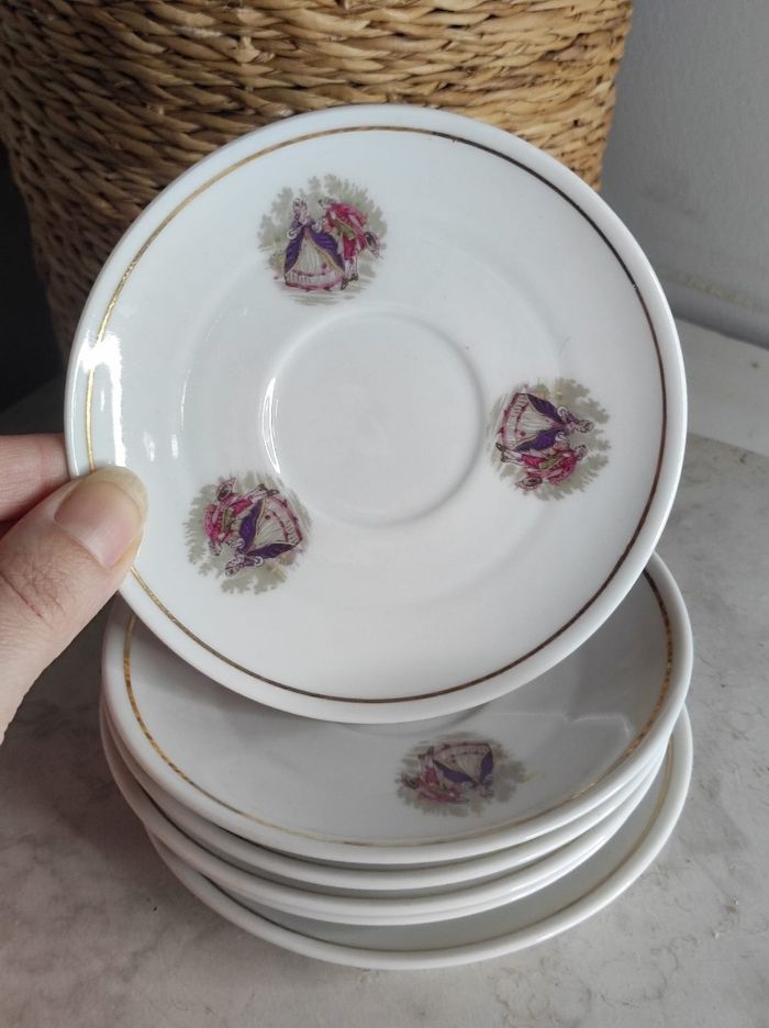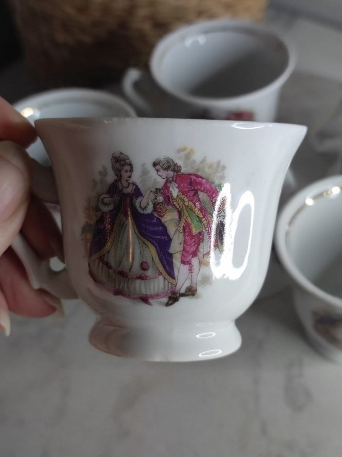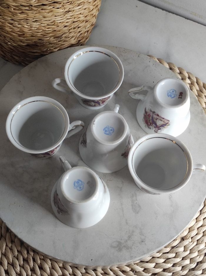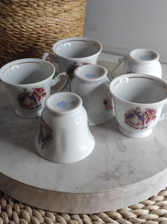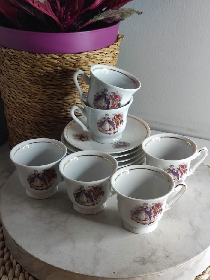 Ensemble de 6 tasses et sous tasses à café au personnages d'antan au liseré doré, en porcelaine de Yougoslavie. En parfait état
