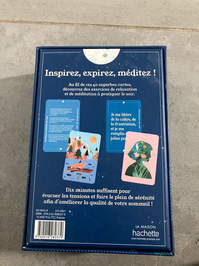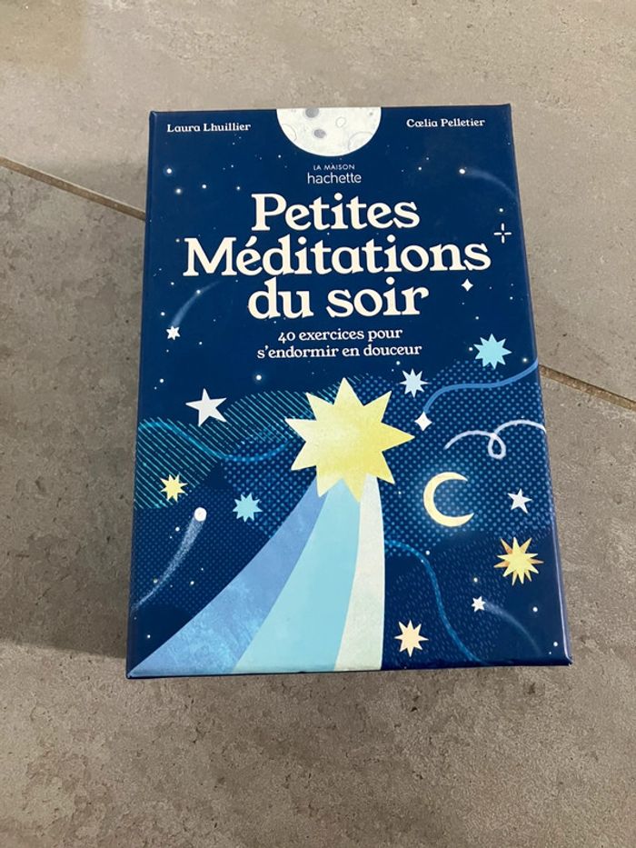 Petites Méditations du soir: 40 exercices pour s'endormir en douceur De Coelia Pelletier Le désign et les illustrations sont magnifiques !!! Inspirez, expirez, méditez ! Cette boîte anti-stress contient 40 cartes proposant des exercices de relaxation et de méditation à pratiquer le soir. En dix minutes maximum, évacuez les tensions et faites le plein de sérénité pour améliorer votre sommeil ! Retrouvez : - des exercices courts et très faciles à mettre en place au quotidien ; - une notice détaillée pour profiter au mieux de tous leurs bienfaits ; - des illustrations inspirantes pour faciliter le lâcher prise. #angeboujouet #angeboudivers