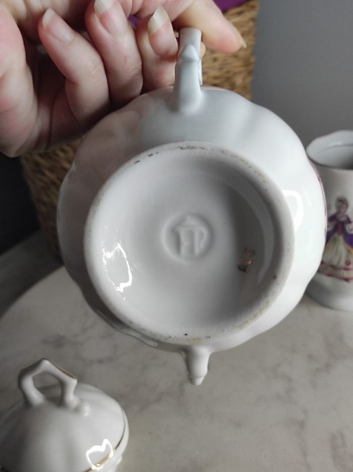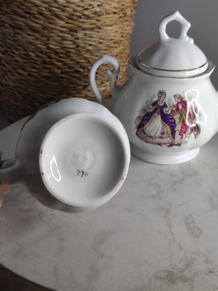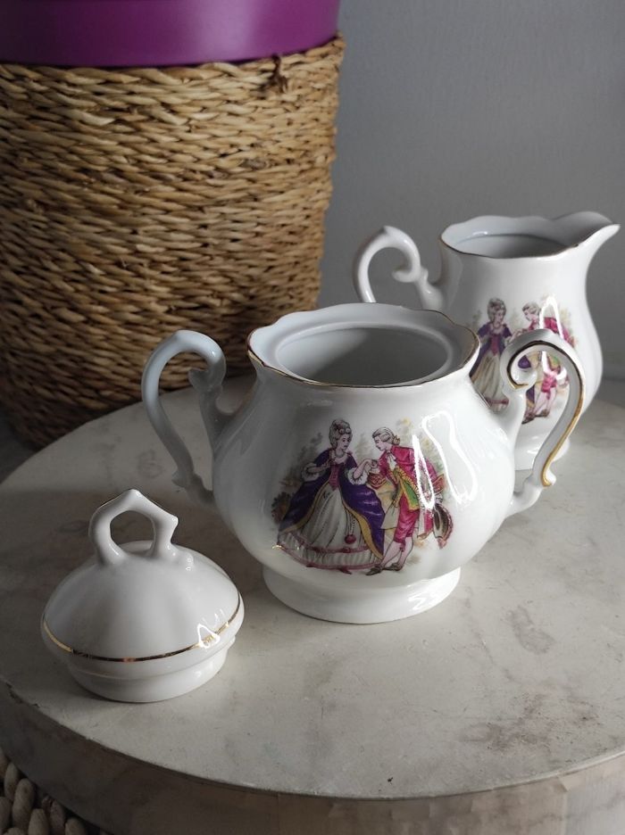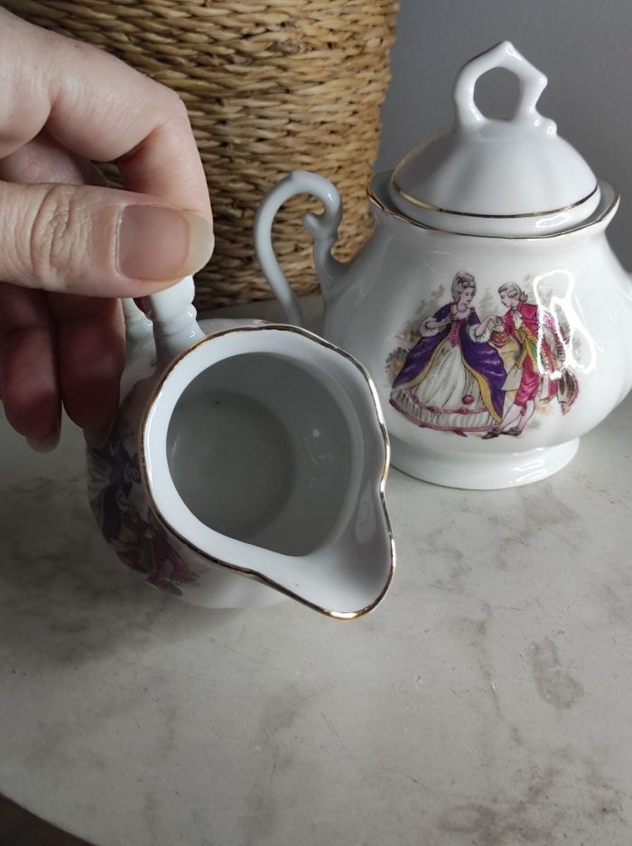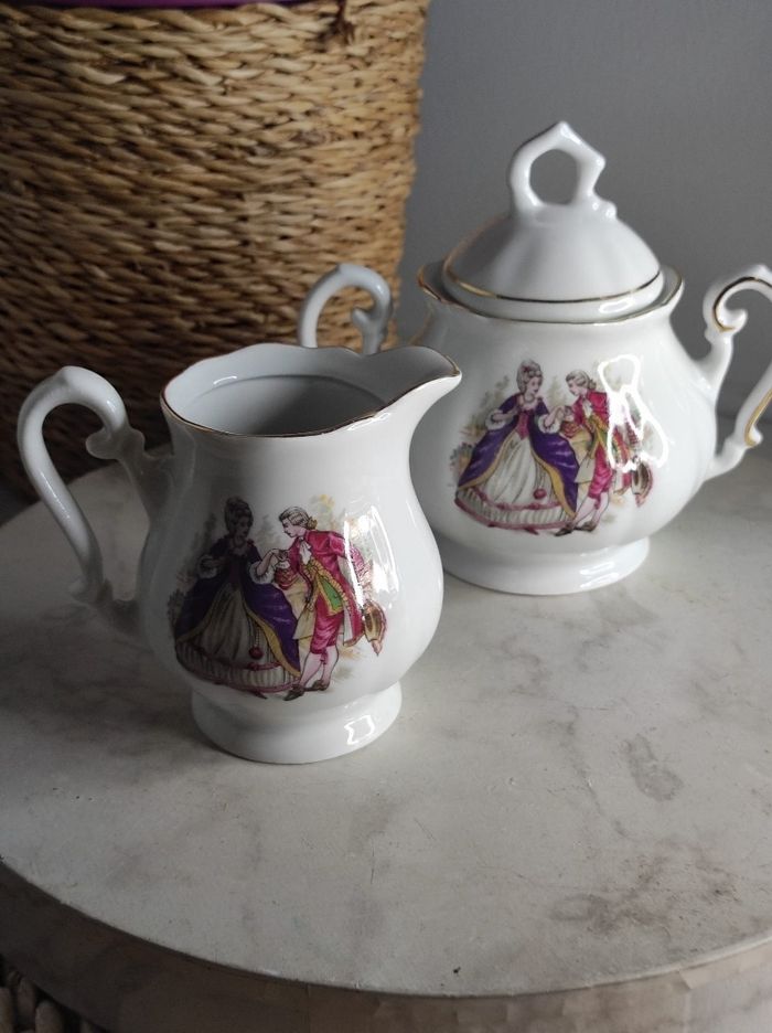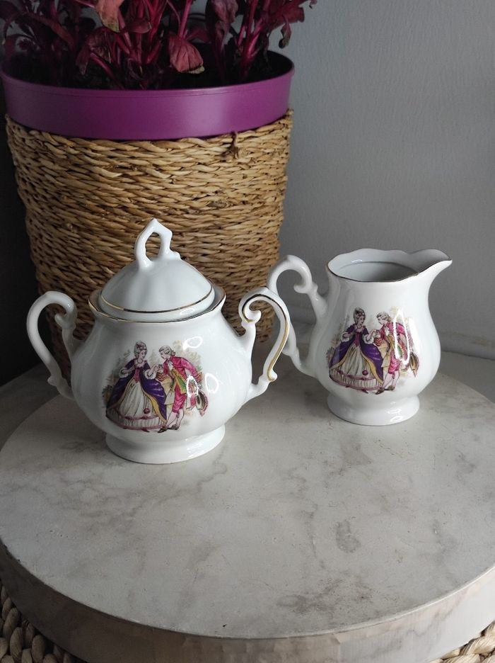 Ensemble de service à porcelaine avec personnages d'antan et liseré doré comprenant un sucrier et un petit pot a lait. H max 11,5 cm x D 8,5 cm En parfait état