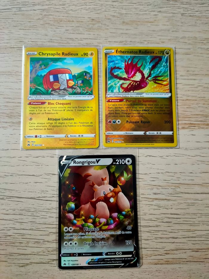 Bonjour, je vends différentes cartes Pokémon de l'extension Zénith Suprême. Les cartes sont toutes officielles.  Prix du lot : 10€ Possible de prendre à l'unité:  3,5€/carte Cartes restantes : 051/159 Chrysapile Radieux 105/159 Éthernatos Radieux 120/159 Rongrigou V Plus de photos possibles sur demande  Livraison possible via le relais de votre choix N'hésitez pas à regarder mes autres annonces ;)