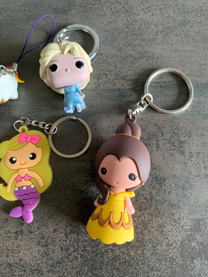 Lot de porte clés dont un disney belle venant du parc disney, un funko reine des neiges 2, …