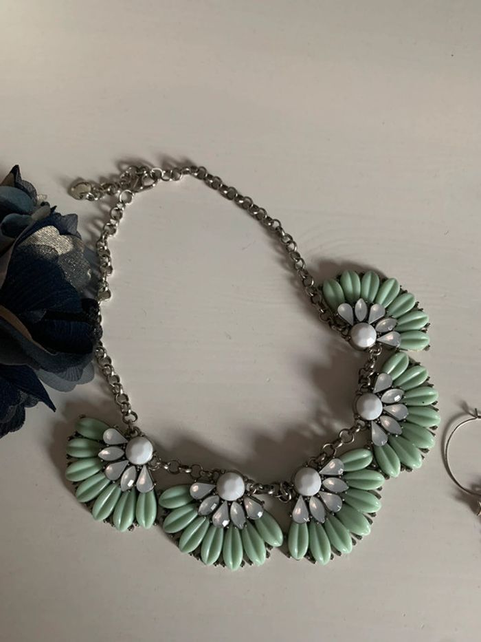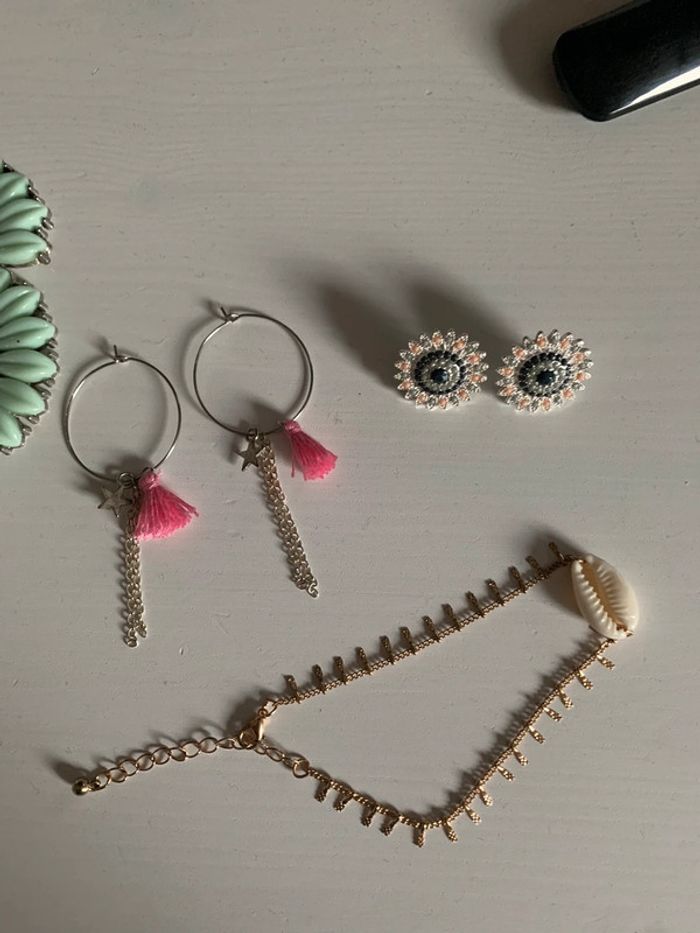 Lot bijoux dont 2 broches, 2 paires de boucles d’oreilles, un bracelet de cheville et un très beau collier de chez promod
