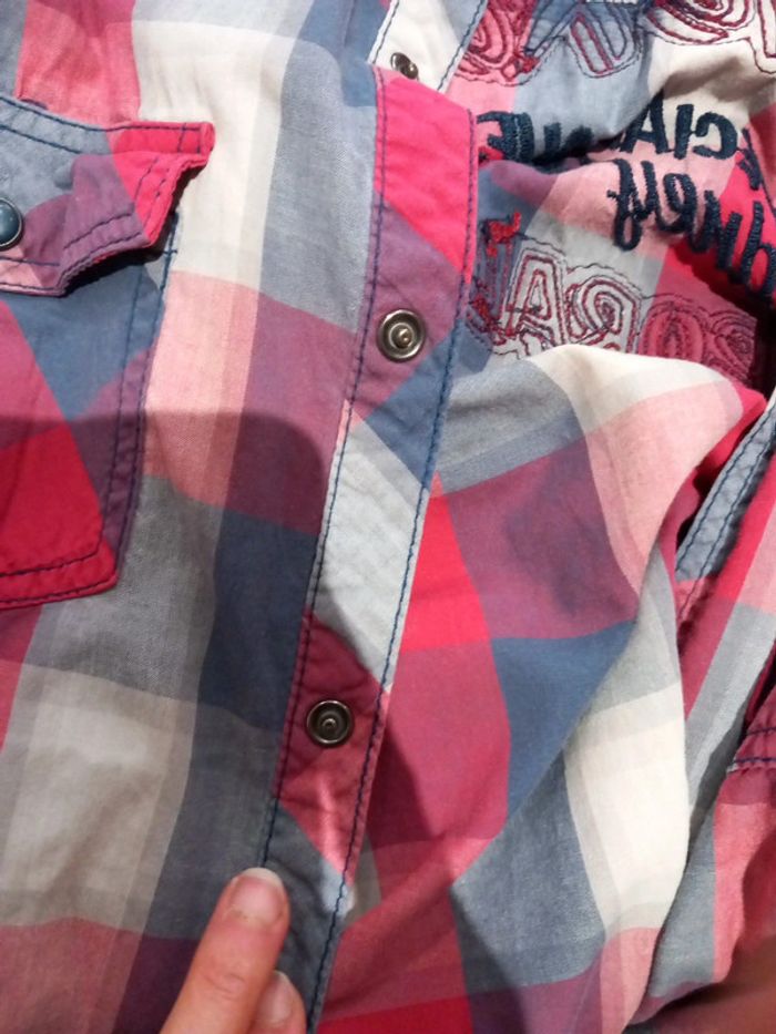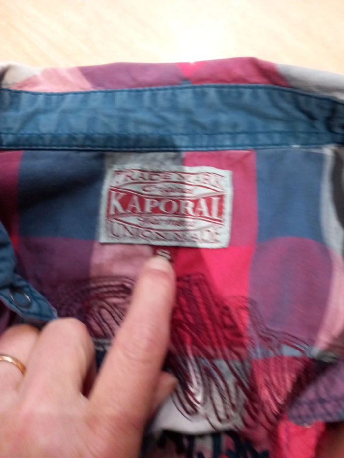 Chemise de marque KAPORAL taille S. Mais elle taille grand donc elle peut aller à quelqu'un qui fait taille M. Ce sont des boutons pressions. Les manches peuvent être réduite (dernière photo)