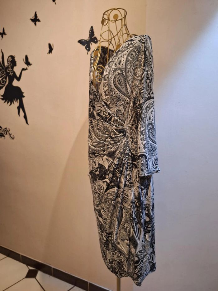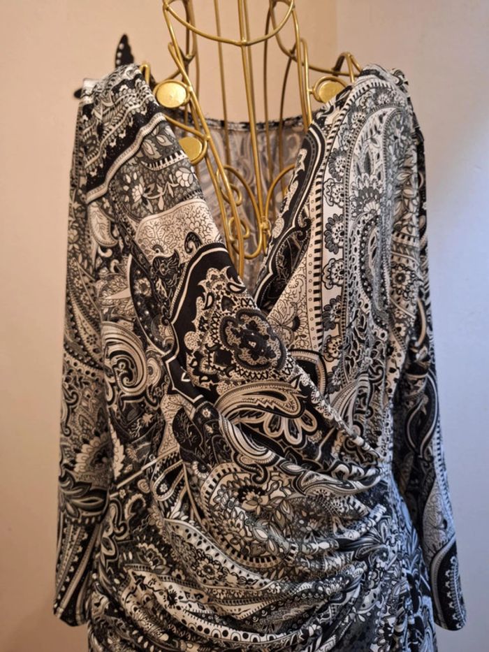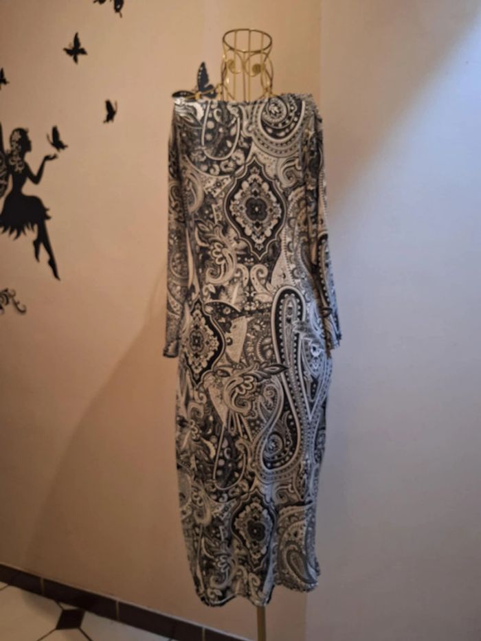 Robe & imprimé bandana noire et blanche - longueur 104 cm - manches 3/4 - coupe cintrée et moulante - la matière est extensible et s'adapte à votre morphologie - matière fluide & satinée - taille 2 convenant aux tailles S & M ou 36 & 38 - fabrication française - état sans défaut ps : je ne fais pas de photo portée #robeimprimée #imprimébandana #robemadeinfrance #madeinfrance