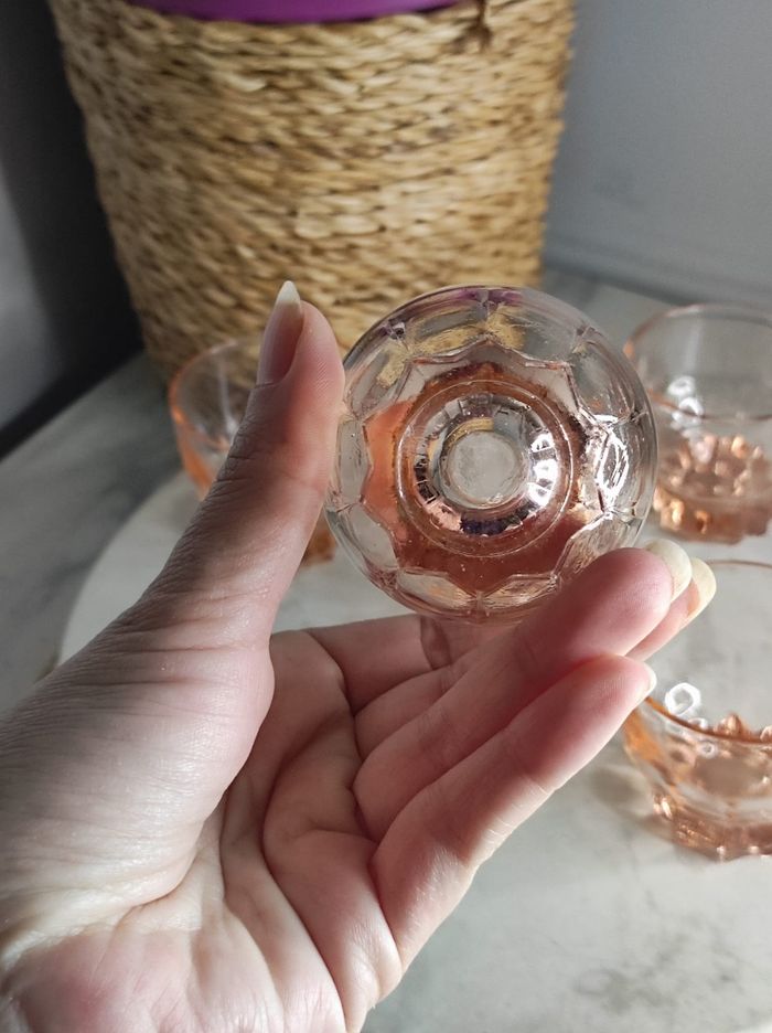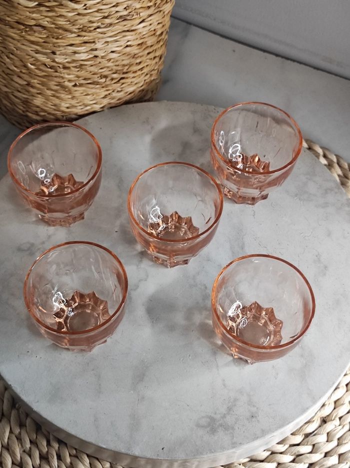 Ensemble de 5 petites tasses a liqueur en verre rose transparent datant des années 40. En parfait état Dimensions H 5,7 cm x D 6 cm