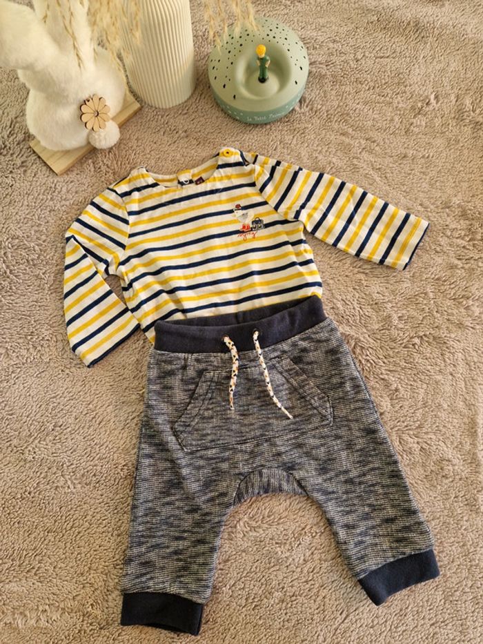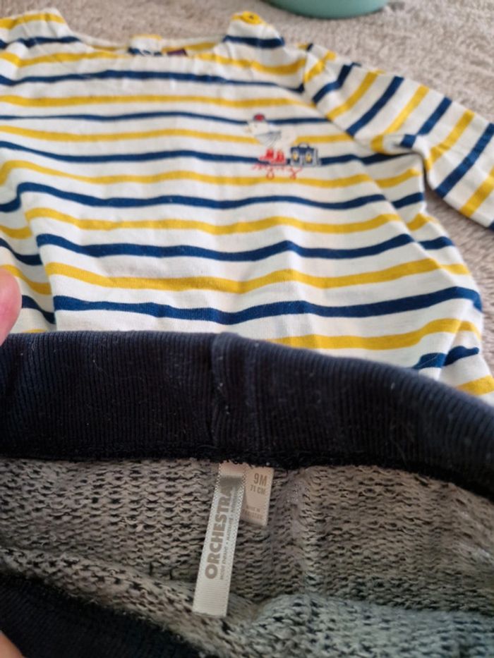 Si vous souhaitez créer un lot, les réductions sont activées 😊 : #arenascGarçonTaille9Mois En très bon état, ni trou, ni tâche. Ensemble comprenant: 🐿1 pantalon chiné bleu. Marque: Orchestra 🐿1 tee-shirt marinière blanc, jaune et bleu Marque: Sergent Major.