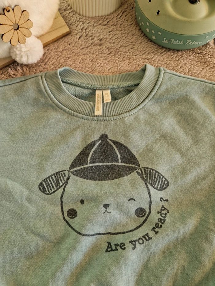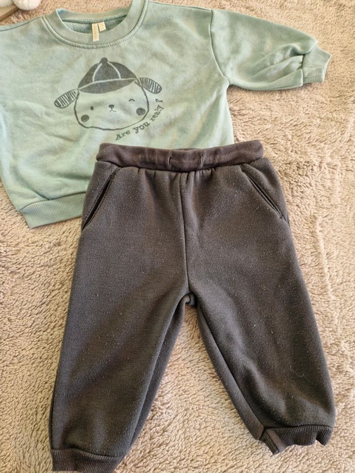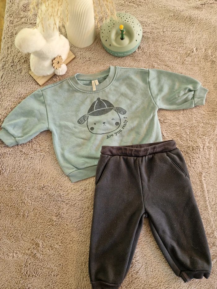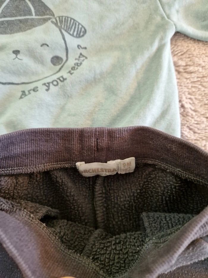 Si vous souhaitez créer un lot, les réductions sont activées 😊 : #arenascGarçonTaille9Mois Tissus en bon état: le pantalon bouloche, ni trou, ni tâche. Ensemble, de chez Orchestra, comprenant: 🐿1 pantalon gris foncé 🐿1 sweat vert, motif chien, "are you ready?"