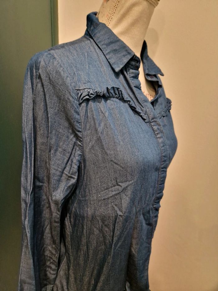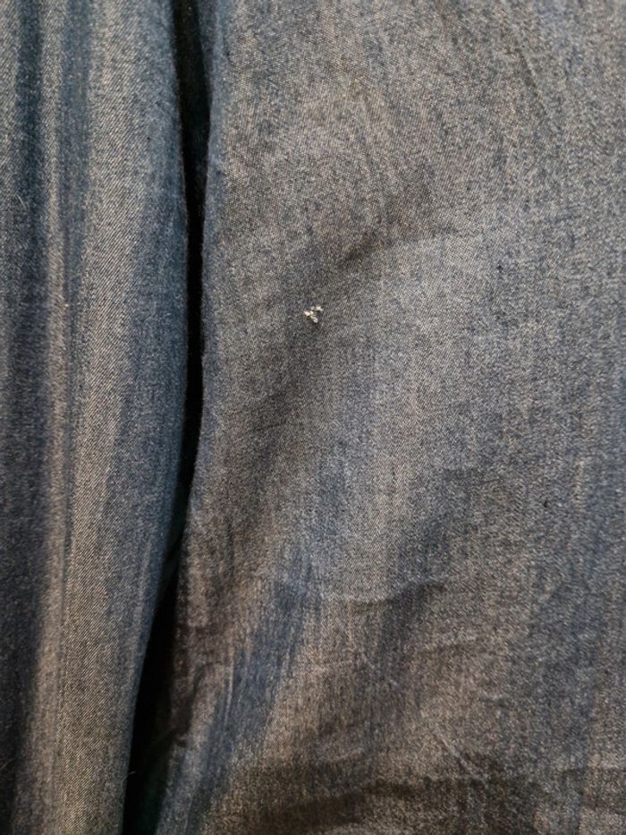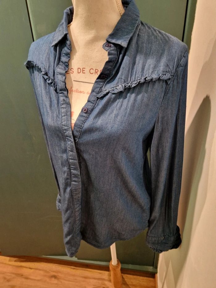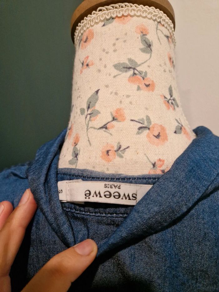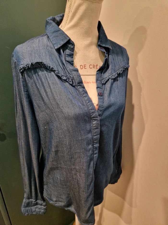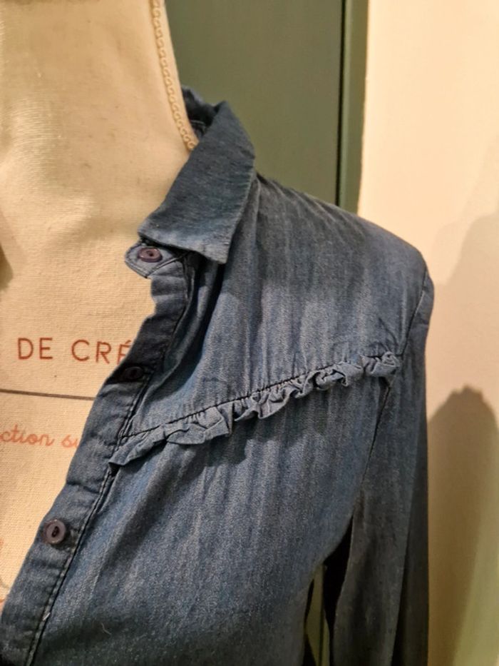 Si vous souhaitez créer un lot, les réductions sont activées 😊 : #arenascFemmeTailleS En très bon état, petit défaut sous la poitrine droite (photo 3 et 4), ni trou, ni tâche. Chemise en jean fin, avec volants sur la poitrine et aux manches. Elle est en lin (30%) et en coton(70%). Marque: Sweewë, taille S.