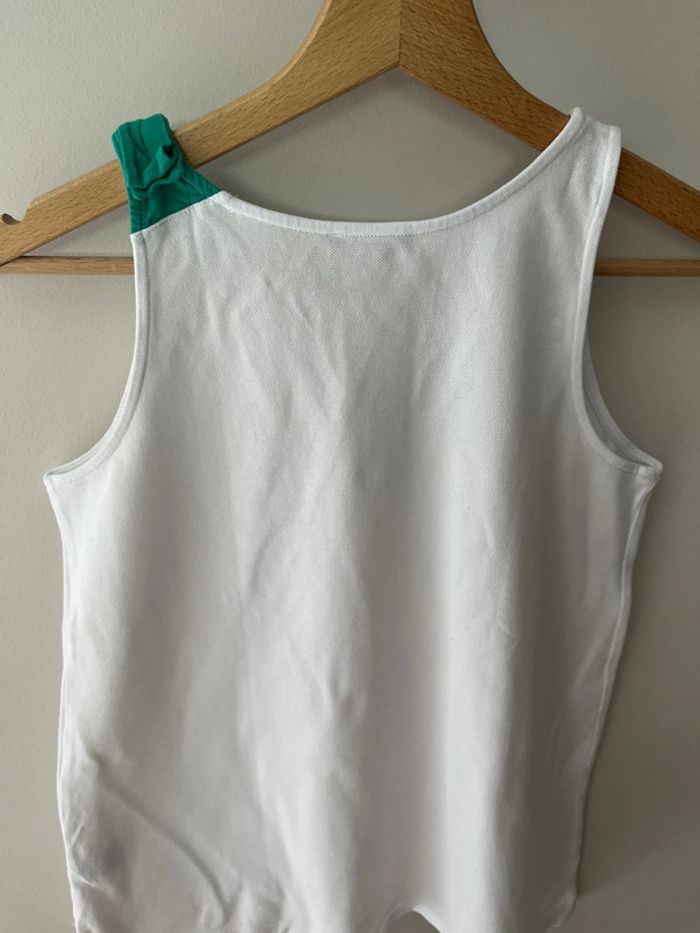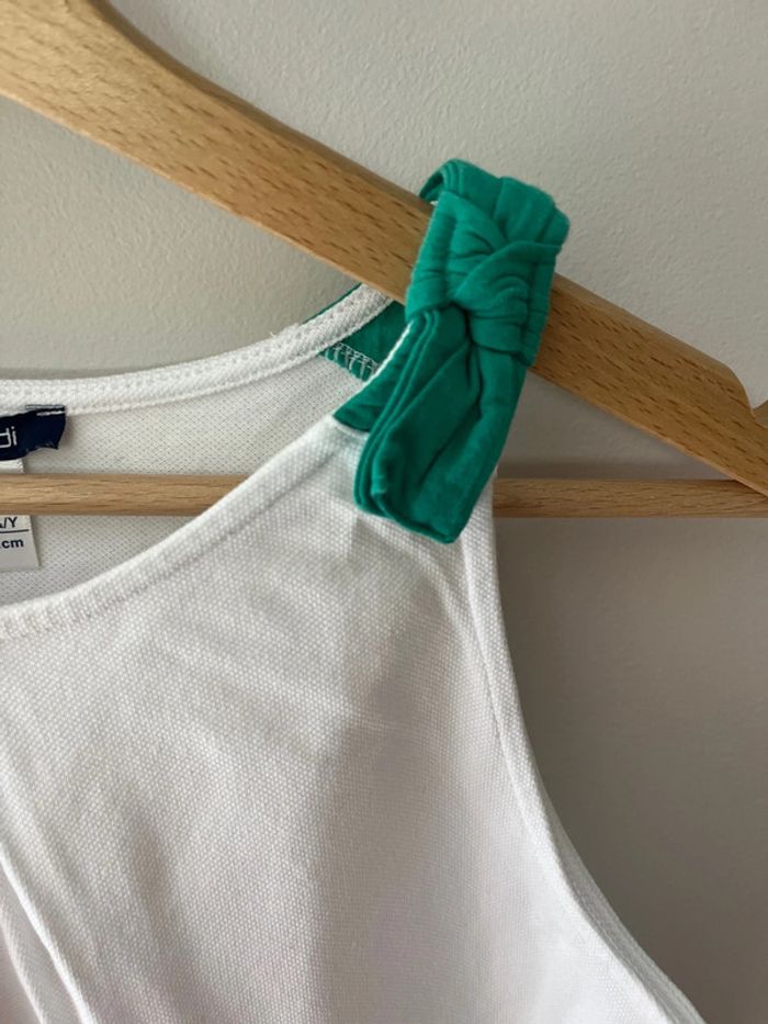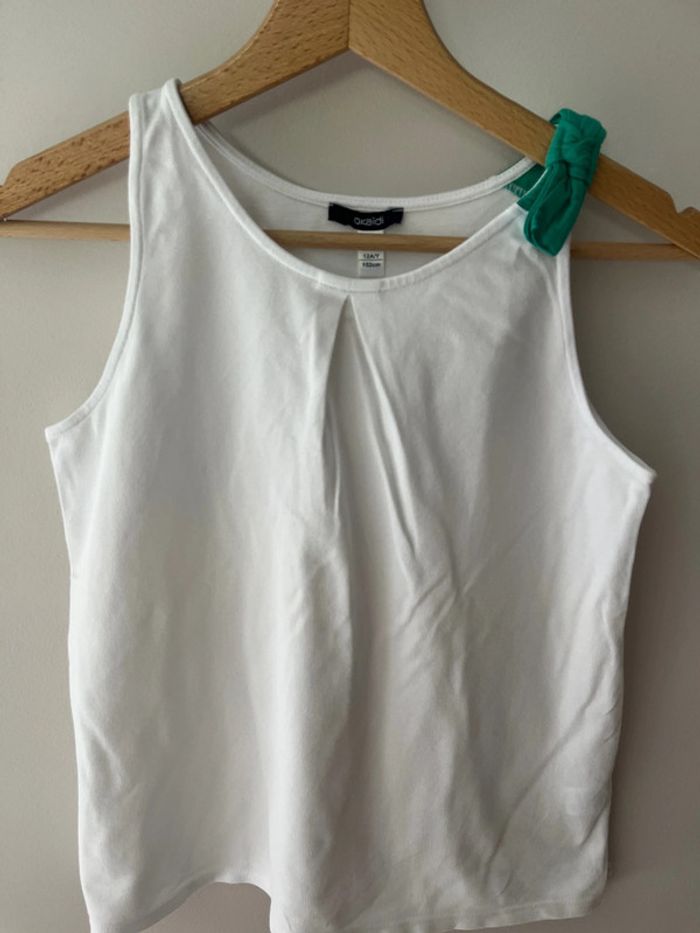 Débardeur Okaïdi taille 12 ans couleur blanc Faux noeud vert sur l’épaule gauche 95% coton 5% élasthane