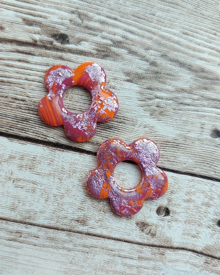 Pampilles en forme de fleur en argile polymère vernie. Effet métallisé mauve. Pour customiser les bijoux (créoles, colliers etc). Diamètre 2,5 cm
