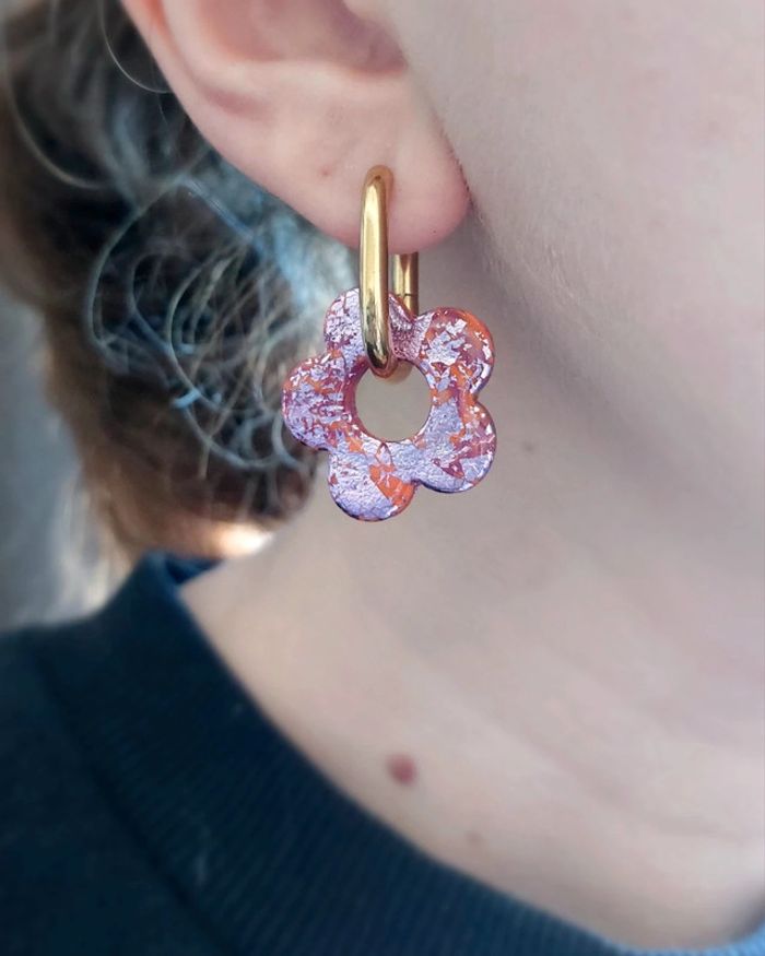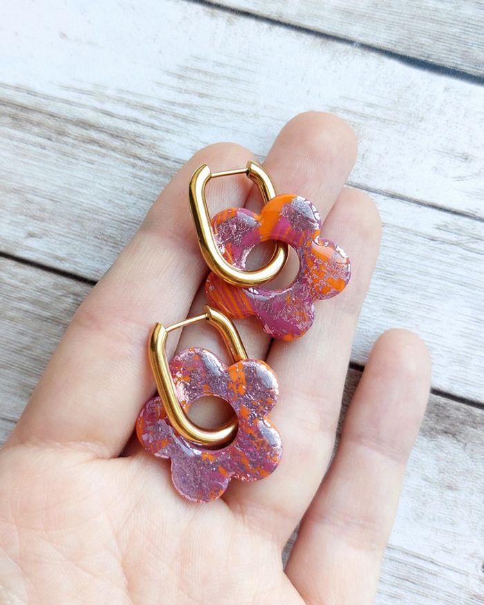 Boucles d'oreilles avec créoles rectangulaire en acier inoxydable et fleurs en argile polymère vernie. Longueur totale 3,5 cm