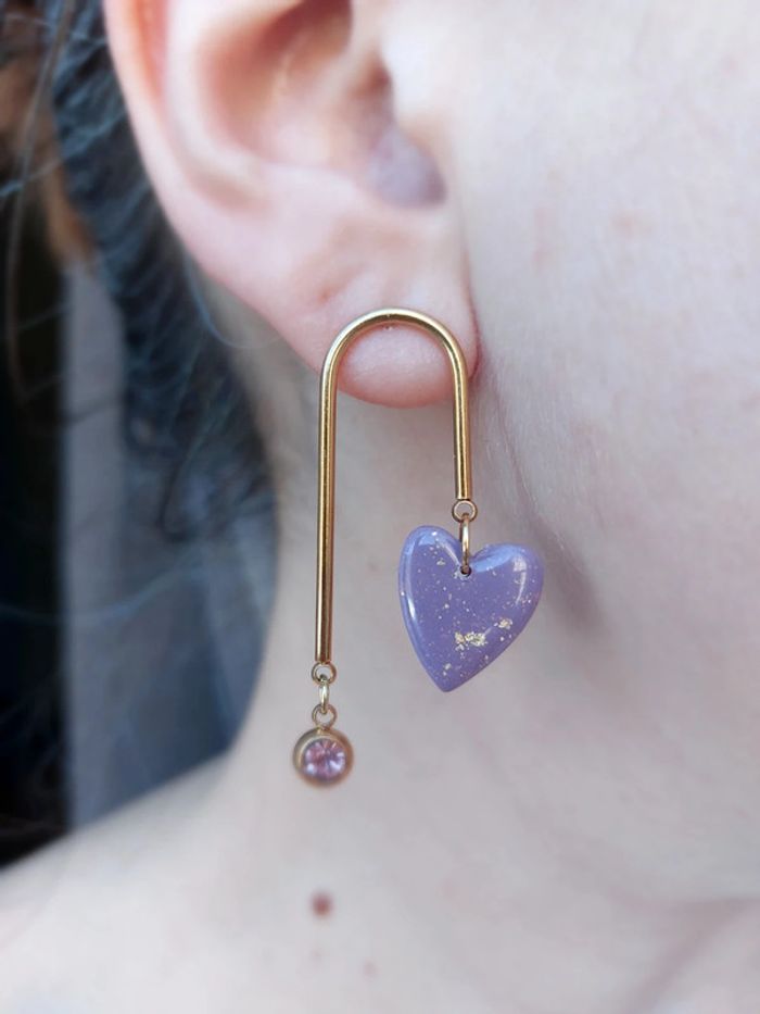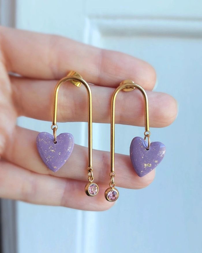 Boucles d'oreilles en acier inoxydable doré et coeurs en argile polymère mauve. Longueur max 5.8 cm Légères