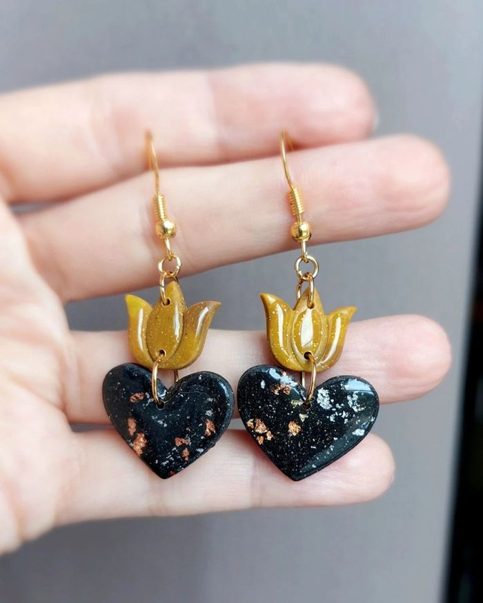 Boucles d'oreilles en acier inoxydable doré et argile polymère vernie. Coeurs style ex-voto sacré. Longueur totale 5.3 cm Légères