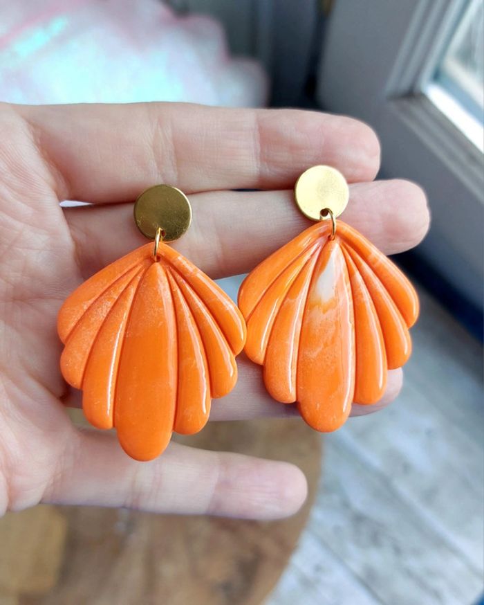 Boucles d'oreilles en acier inoxydable doré et argile polymère vernie. Longueur 5 cm Légères
