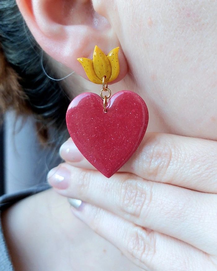 Boucles d'oreilles en argile polymère vernie. Pour oreilles percées, tiges en acier inoxydable doré. Longueur 4.2 cm Légères