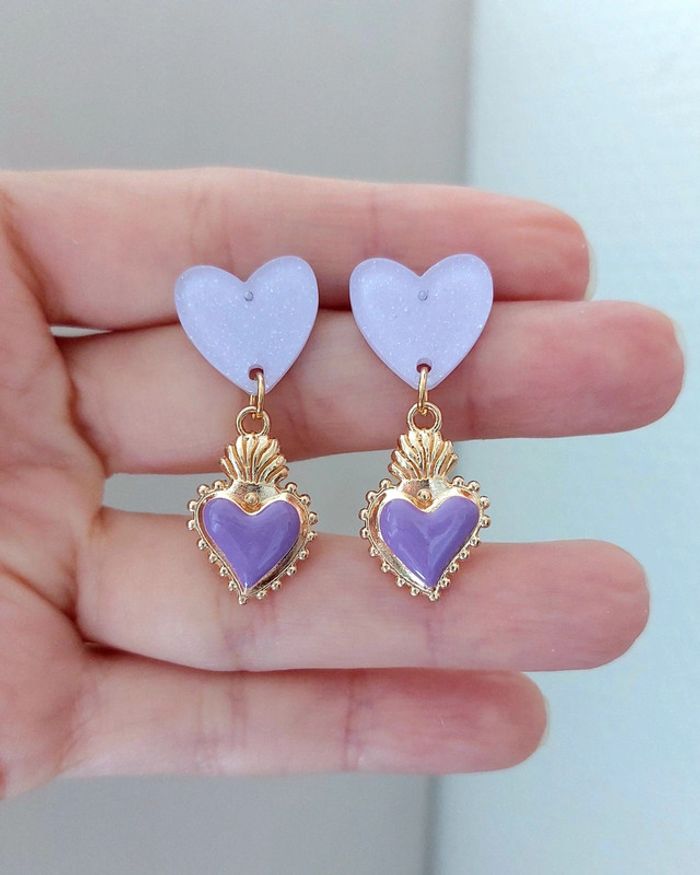 ✨️ Pour voir toutes les boucles d'oreilles dispo dans ma boutique #liliteboucles ✨️ Boucles d'oreilles en métal doré laqué mauve et résine mauve pailletée. Coeurs sacrés ex-voto. Pour oreilles percées. Longueur 3.5 cm Légères