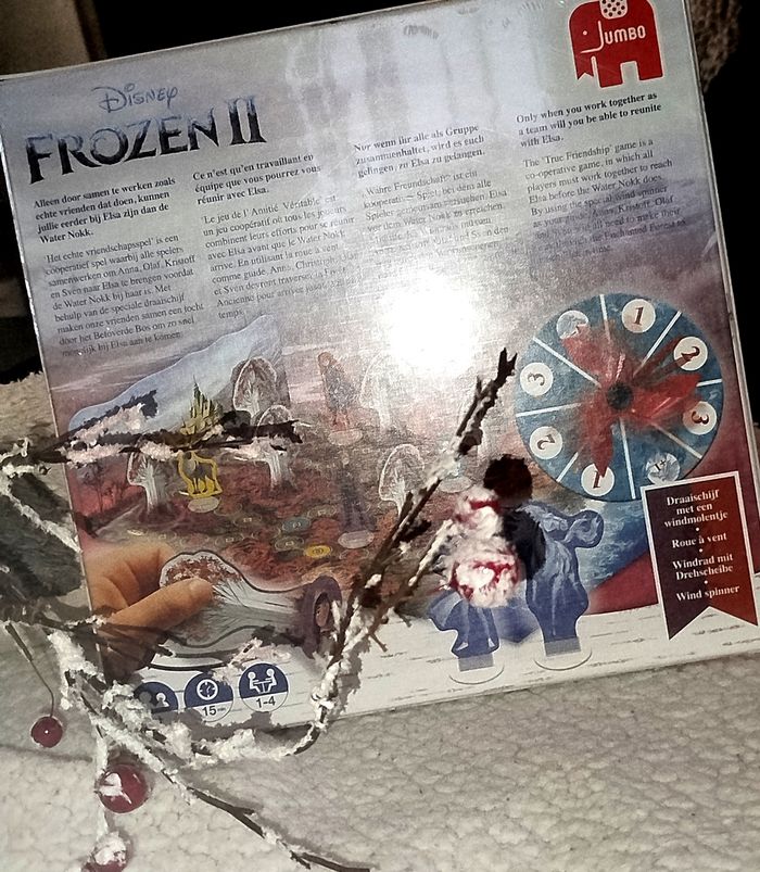 🎄.Neuf sous blister Jeu de société Elsa est en danger : le Nokk fonce vers elle ! Anna, Olaf, Kristoff et Sven doivent traverser la forêt enchantée au plus vite afin de la sauver. En solo ou jusqu'à 4 joueurs, les enfants doivent travailler ensemble pour rejoindre la Reine des Neiges. Avec ce jeu de société, votre enfant revit les aventures magiques de ses personnages préférés tout en travaillant l'esprit d'équipe, la coopération, les chiffres et la réflexion. La boîte de jeu inclut un plateau, 8 arbres en carton, 6 figurines en carton et leurs supports, une roue et les règles du jeu. Le jeu est destiné aux enfants dès 4 ans.