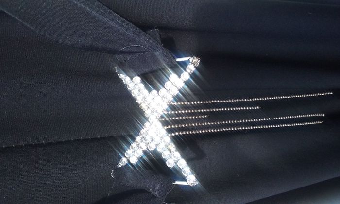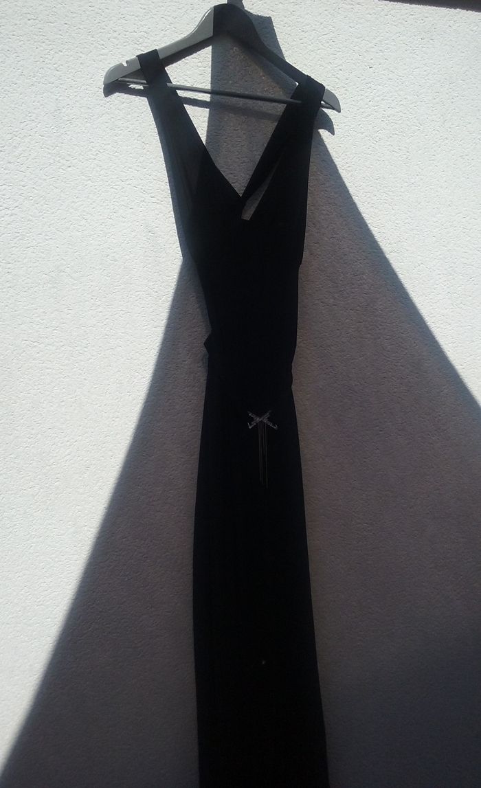 L'élégance au féminin! Décolleté plongeant, dos nu croisé, tissu fluide et léger, noir intense, taille haute, jambes larges, ceinture à strass (il en manque 2), extensibilité légère peut donc convenir aussi bien à un 38 qu'à un 40, fabrication française!