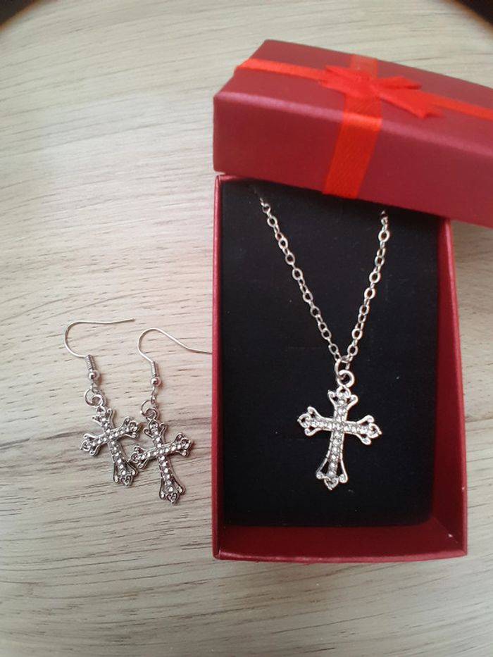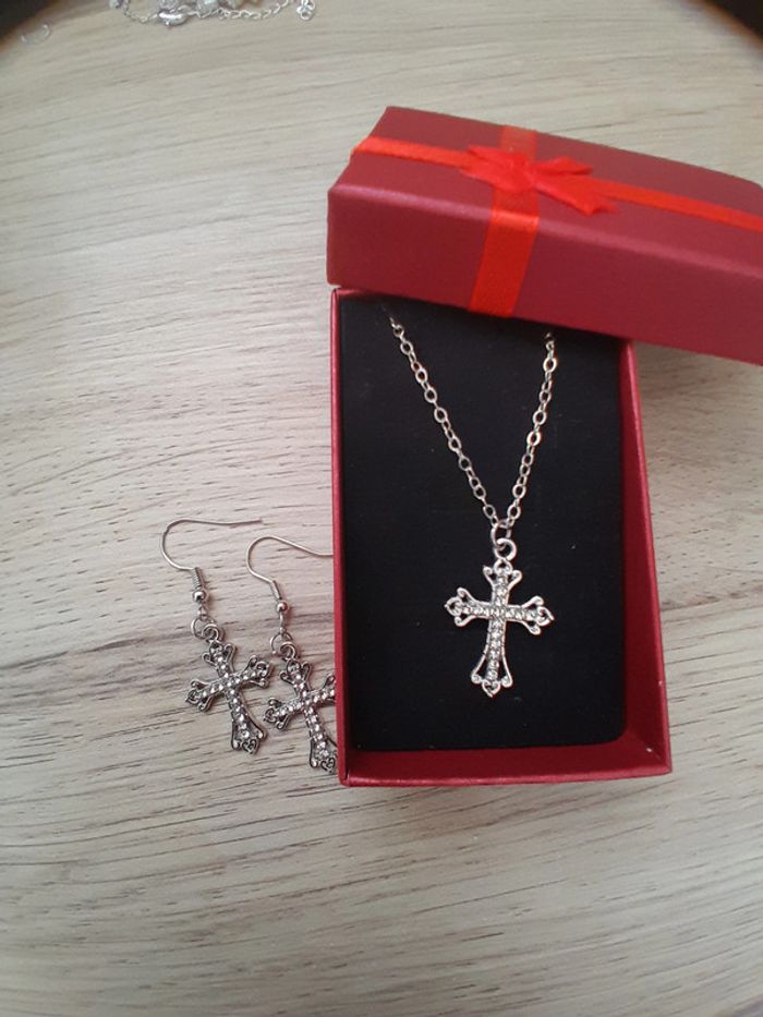 Ensemble Collier et boucles d'oreilles, croix, couleur argentée - photo numéro 1