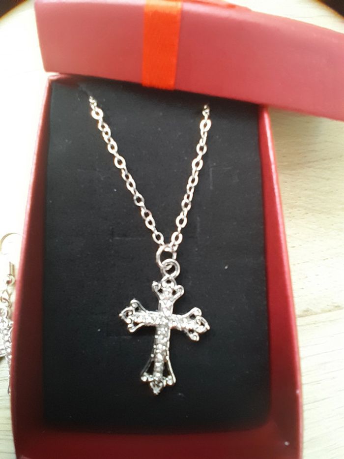 Ensemble Collier et boucles d'oreilles, croix avec strass couleur argentée la chaîne du collier mesure : 42cm la croix du collier mesure : 2,9cm de hauteur et 1,8cm de largeur les boucles d'oreilles pendantes mesurent : hauteur 5cm X 1,8cm Alliage