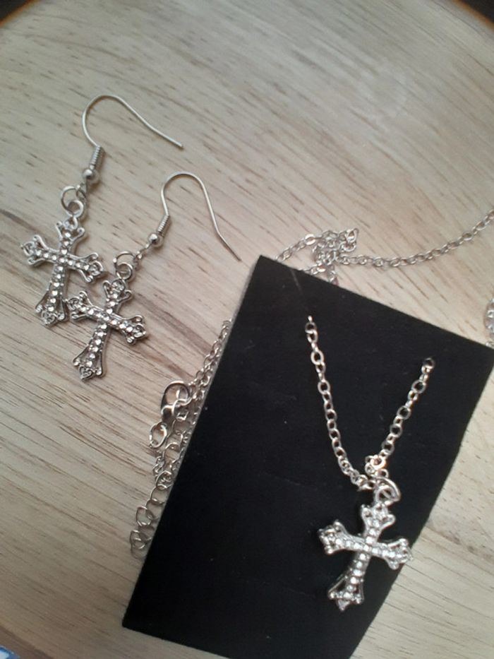 Ensemble Collier et boucles d'oreilles, croix, couleur argentée - photo numéro 2