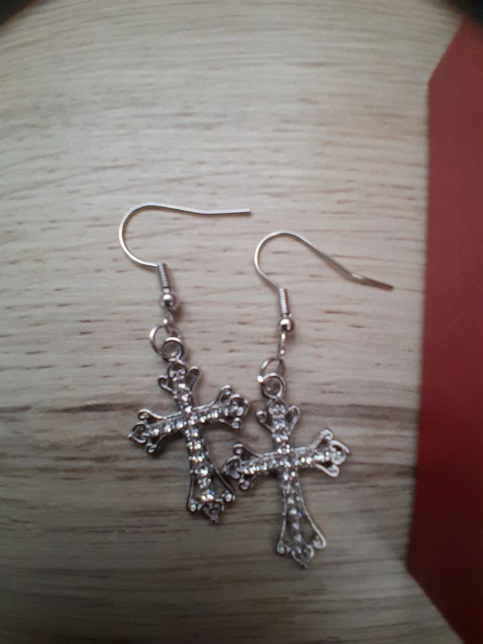 Ensemble Collier et boucles d'oreilles, croix, couleur argentée - photo numéro 5