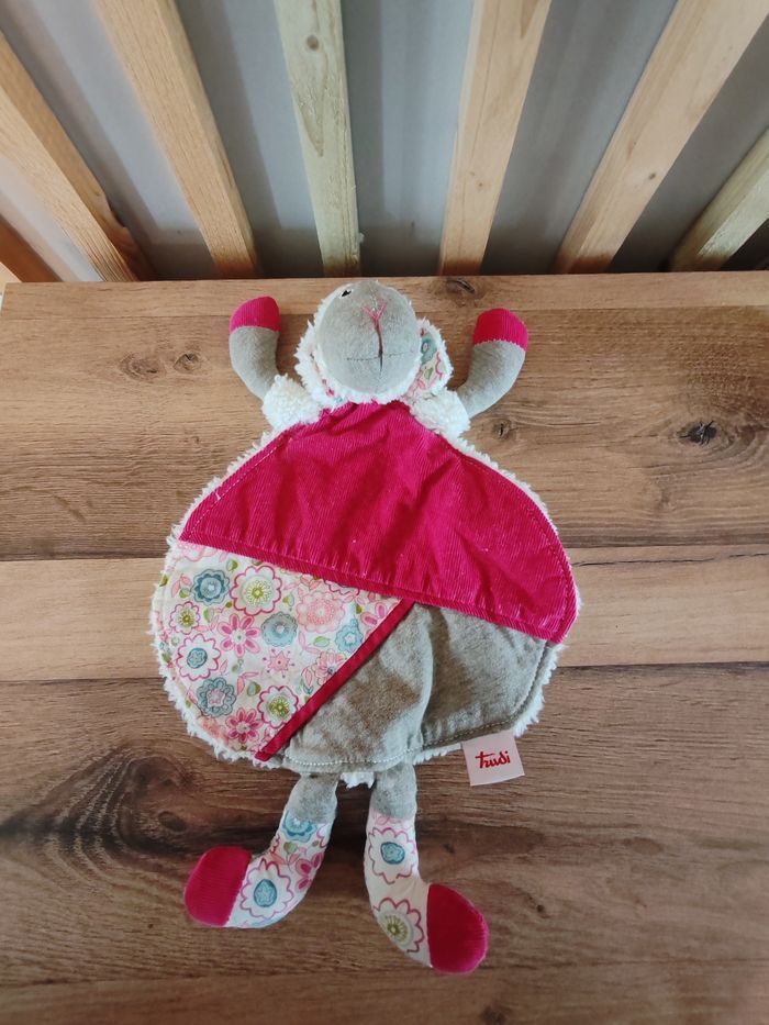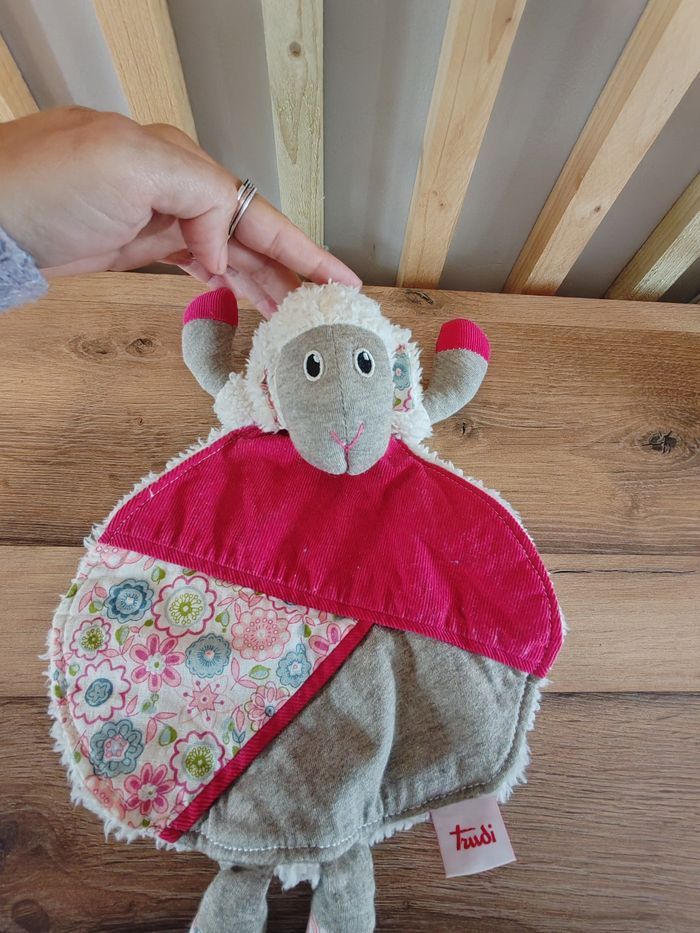 Doudou plat mouton blanc gris rose fleurs TRUDI Tbe Étiquette marque présente 11.90 euros Envoi en relais