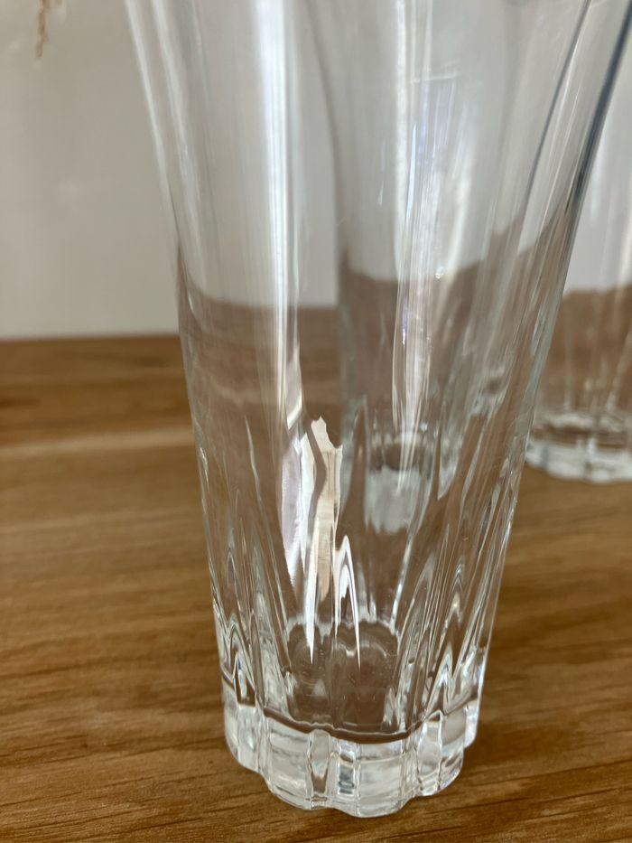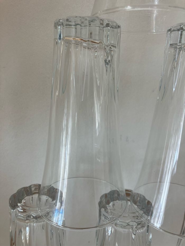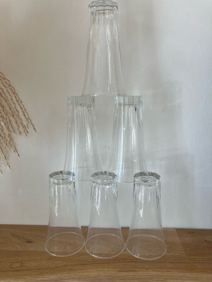 Ce lot comporte 6 verres de bar de forme évasée. Ils sont en bon état (pas de fêlure non d’ébréchure) mais portent des traces de calcaire. Dimensions : - hauteur : 11,5 cm - diamètre base : 4 cm - diamètre supérieur : 6 cm